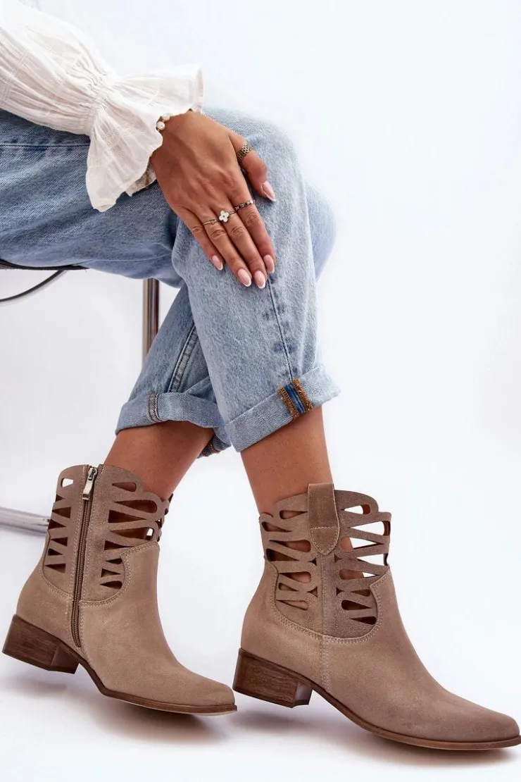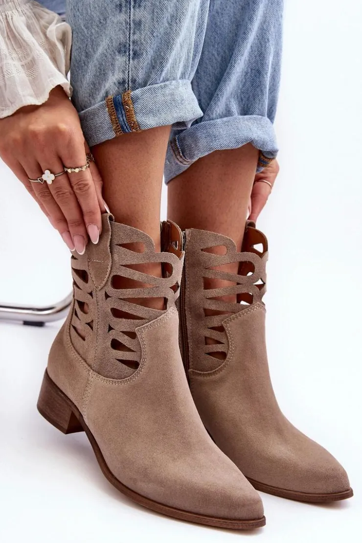 Damskie botki zostały wykonane z wysokiej jakości skóry naturalnej. Zapinane na suwak z boku. Osadzone na płaskim obcasie, co sprawia, że są niezwykle wygodne i stabilne. Noski w szpic optycznie wysmuklą nogi. Dodatkowo zapiętek jest usztywniony. Model ten posiada miękką wkładkę wykonaną z naturalnej skóry. Przy wyborze rozmiaru prosimy sugerować się tabelą rozmiarów.
