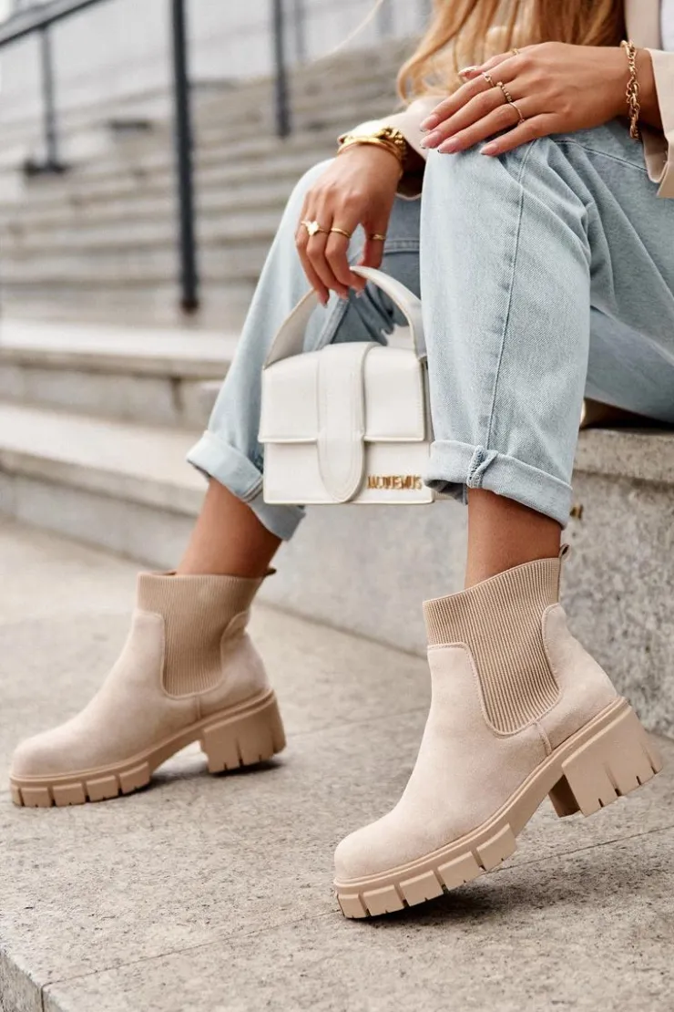 Damskie botki zostały wykonane z eko zamszu. Osadzone na masywnym obcasie oraz platformie. Model wsuwany, noski zaokrąglone. Dodatkowo zapiętek jest usztywniony. Nie czekaj aż znikną i kup już dziś! Przy wyborze rozmiaru prosimy sugerować się tabelą rozmiarów.