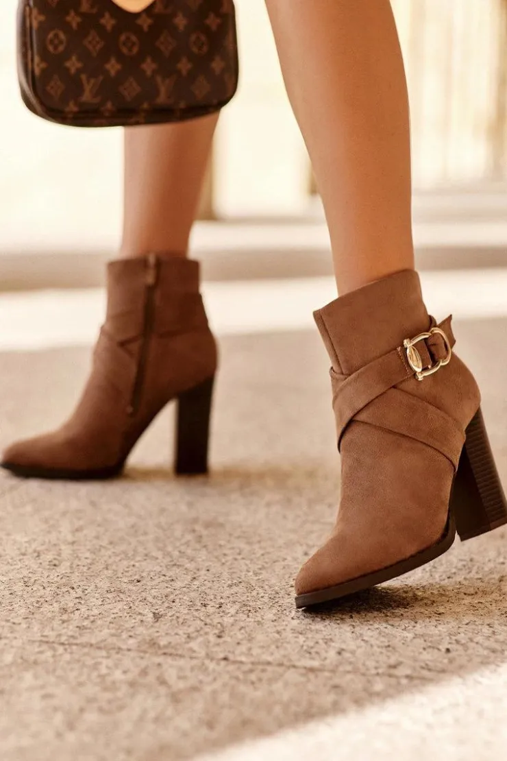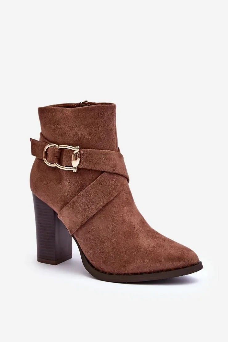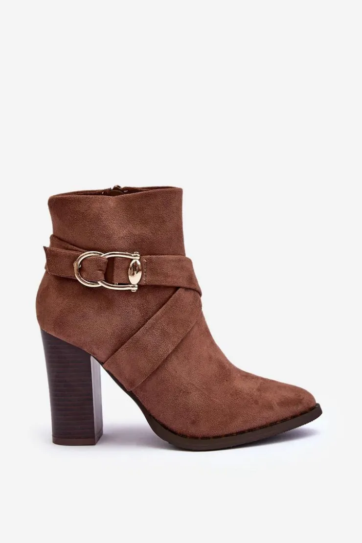 Eleganckie botki za kostkę wykonane z eko zamszu. Osadzone na wysokim obcasie w postaci słupka. Cholewka ozdobiona paskami z klamrą. Model zapinany na suwak. Zapiętek usztywniony, wnętrze ocieplone kocem obuwniczym. Idealny model do eleganckich i imprezowych stylizacji. Przy wyborze rozmiaru prosimy sugerować się tabelą rozmiarów.