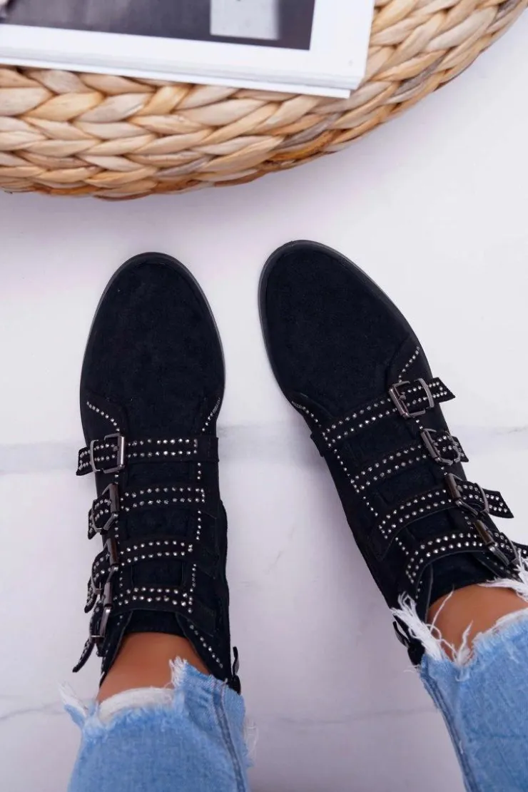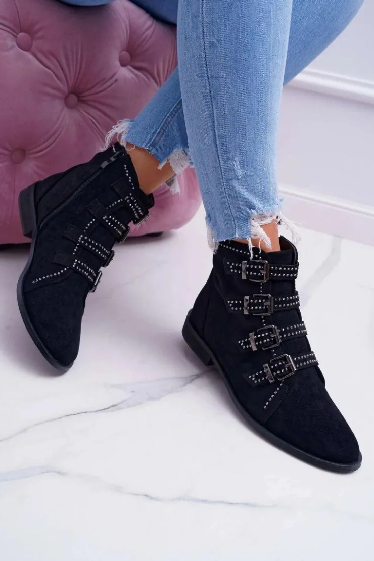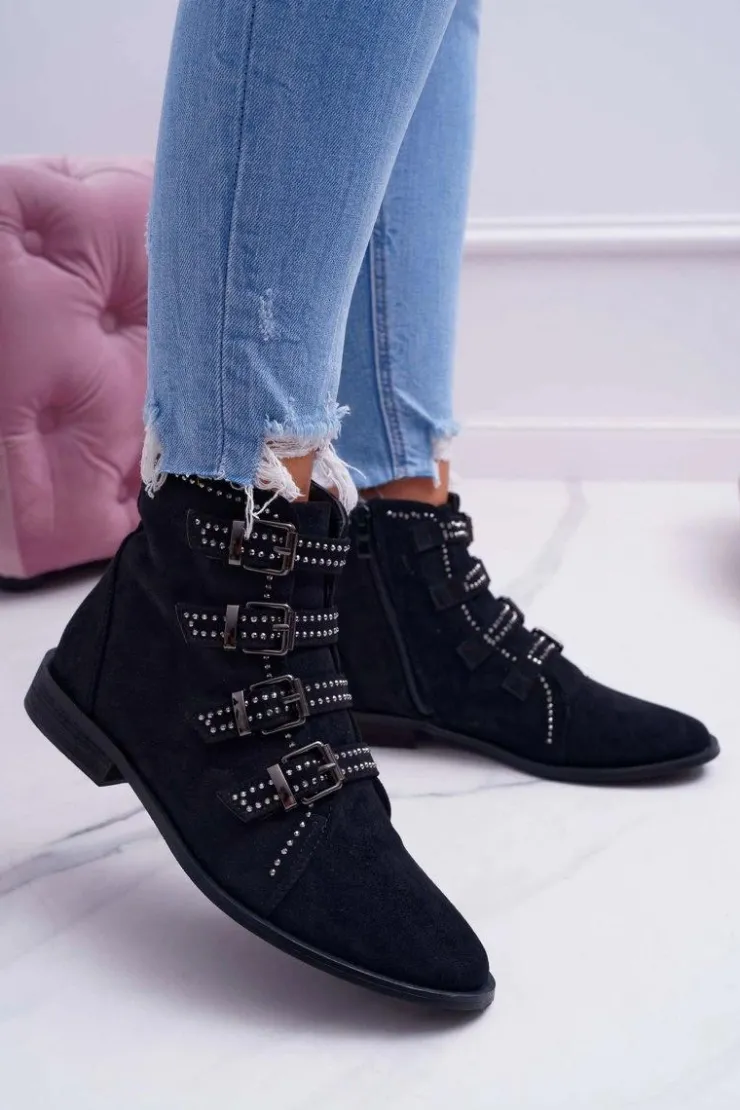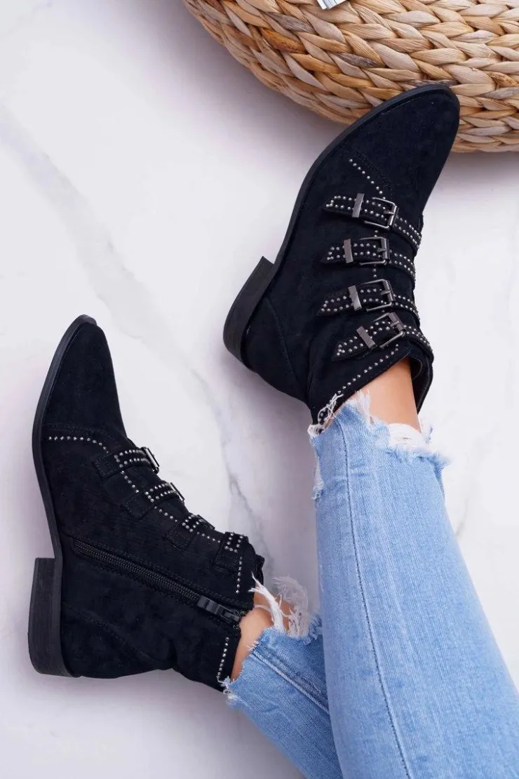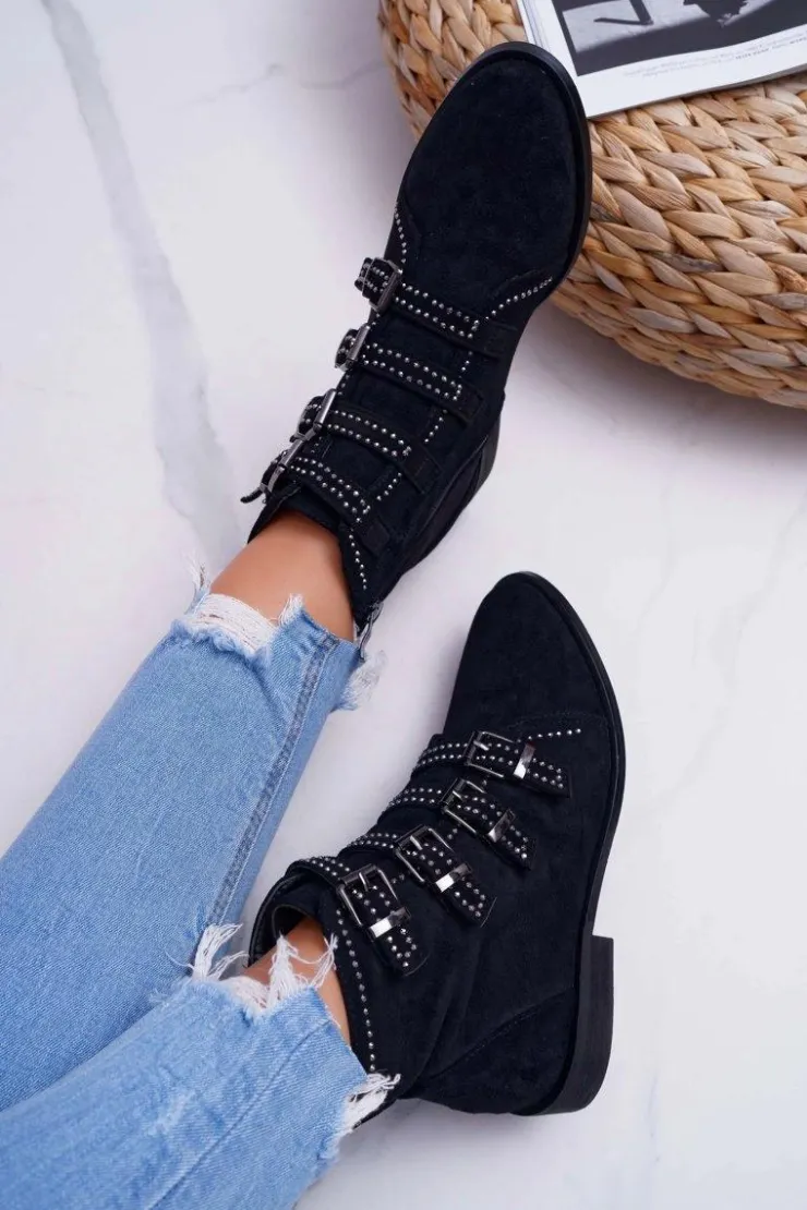 Boto Botki Zamszowe|Botki Płaskie*Damskie Botki Zamszowe Nity Klamry Czarne Berugio