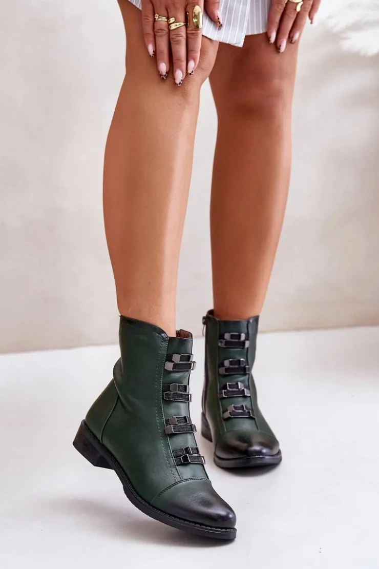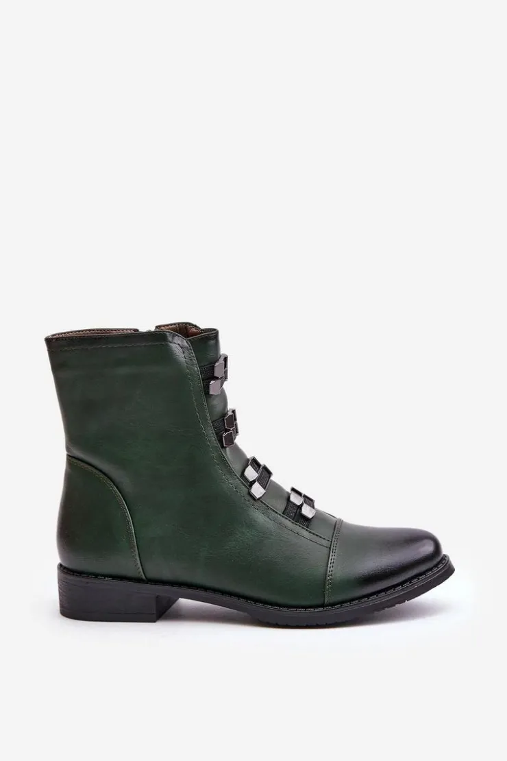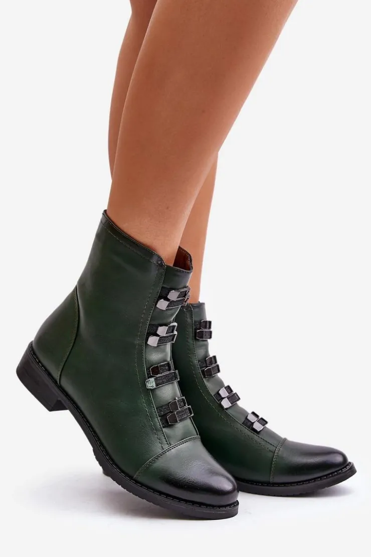Botki marki Jezzi wykonane z eko skóry, które łączą styl z wygodą. Osadzone na płaskim obcasie, z zaokrąglonymi noskami, zapewniają komfort noszenia na co dzień. Zapinane na zamek, co ułatwia zakładanie i zdejmowanie. Model ten wyróżnia się ozdobnymi gumkami z przodu. Wnętrze ocieplane kocem obuwniczym. Te botki to świetny wybór na jesienne i zimowe stylizacje.Przy wyborze rozmiaru prosimy sugerować się tabelą rozmiarów.