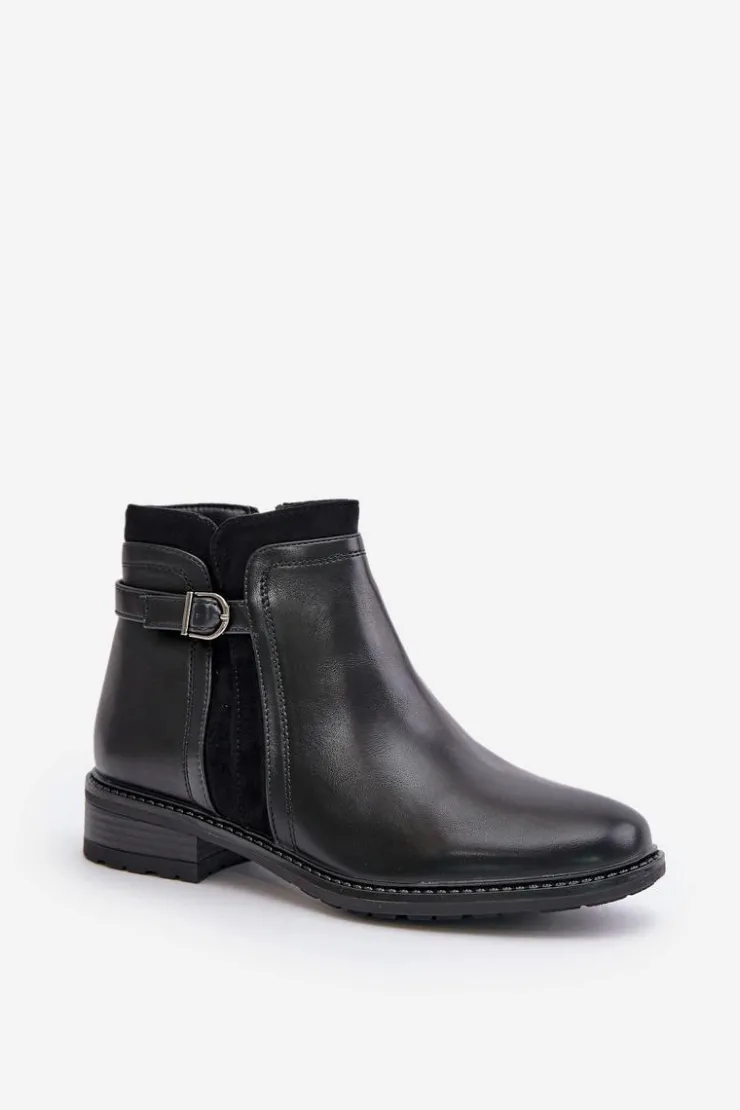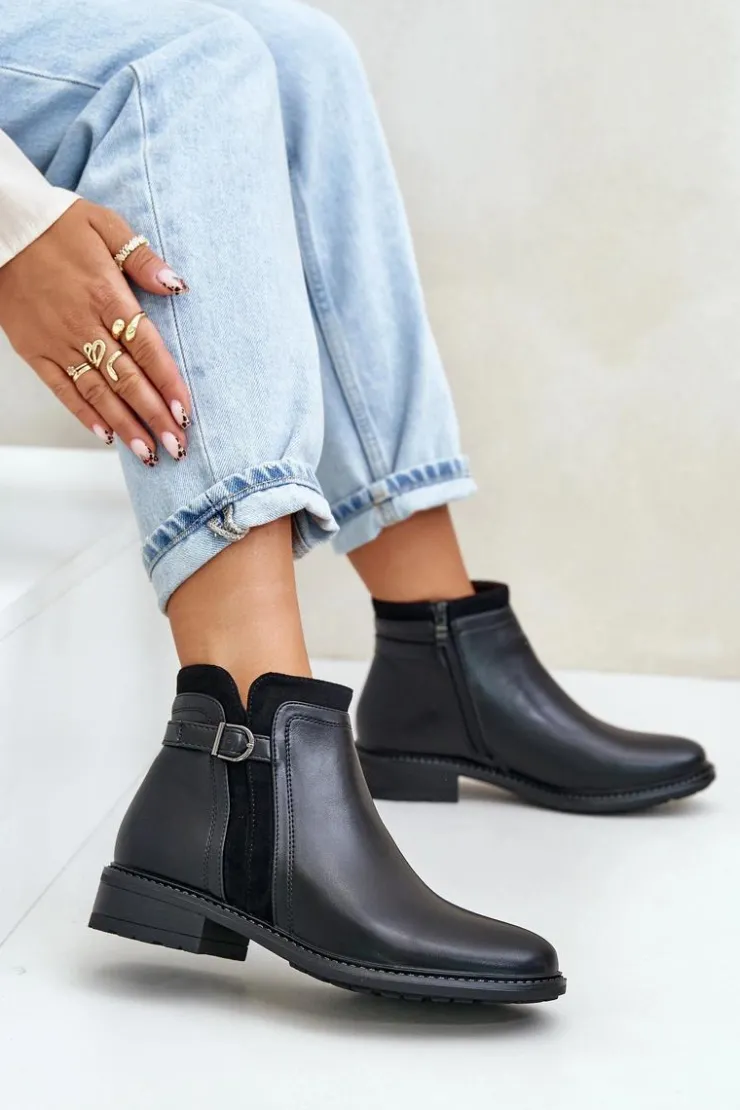 Klasyczne botki damskie świetnie sprawdzą się w wielu stylizacjach! Wykonane ze skóry ekologicznej. Osadzone na płaskim obcasie. Cholewka ozdobiona paskiem z małą ozdobą. Wnętrze ozdobione kocem obuwniczym. Noski zaokrąglone. Przy wyborze rozmiaru prosimy kierować się tabelą rozmiarów