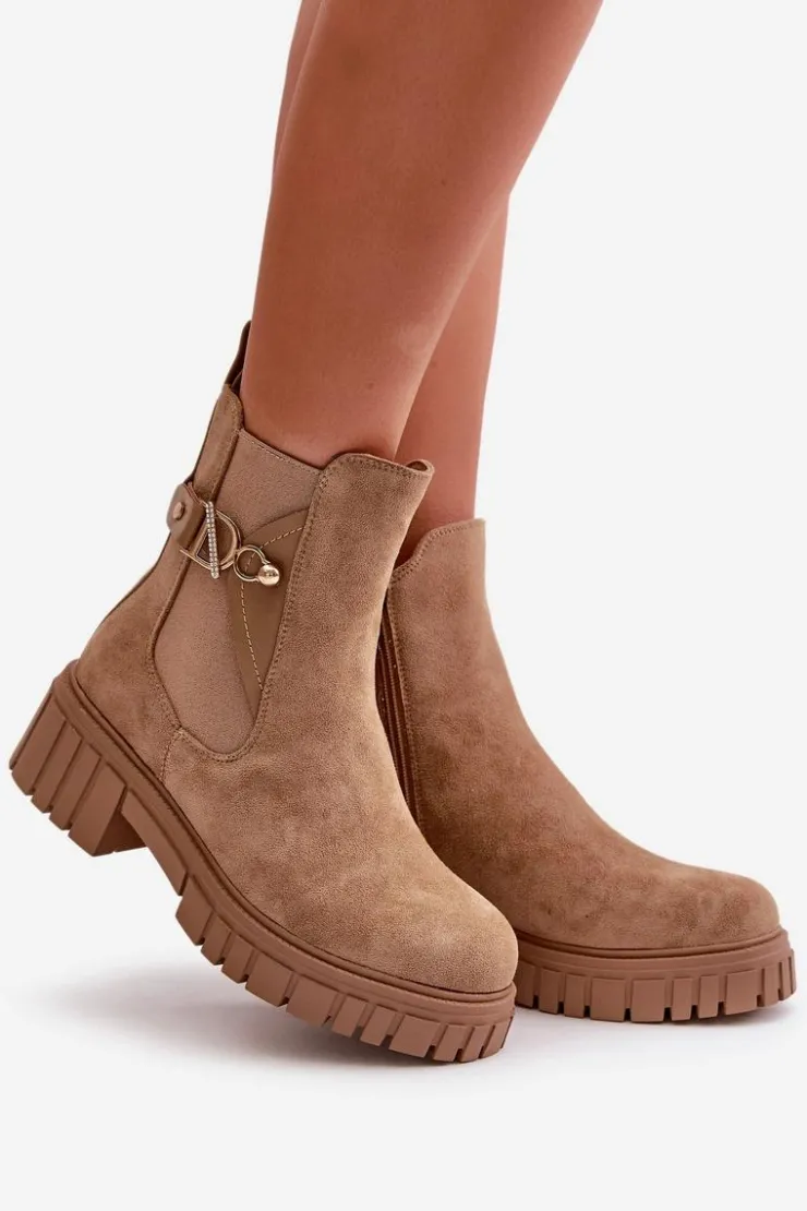 Botki damskie wykonane z miękkiego eko zamszu. Wnętrze ocieplone kocem obuwniczym sprawia, że są one doskonałym rozwiązaniem na chłodne dni. Wyróżniającym się elementem tego modelu jest złoty detal, który dodaje im wyjątkowego uroku i elegancji. Zapinanie na zamek ułatwia zakładanie i zdejmowanie obuwia. Doskonale sprawdzą się w połączeniu z różnymi elementami garderoby, od jeansów po eleganckie sukienki, podkreślając unikalny styl każdej kobiety. Przy wyborze rozmiaru prosimy sugerować się tabelą rozmiarów.