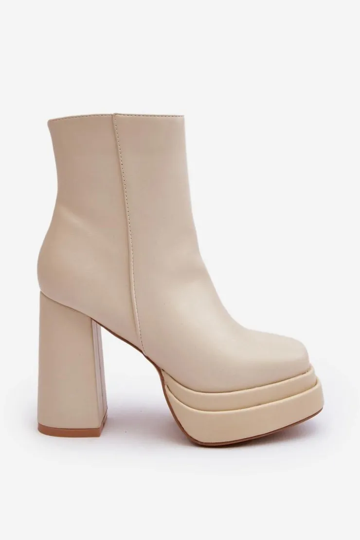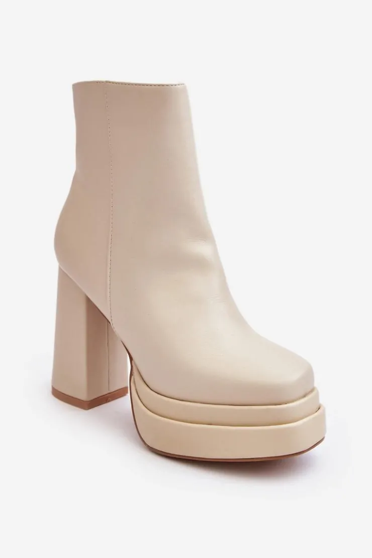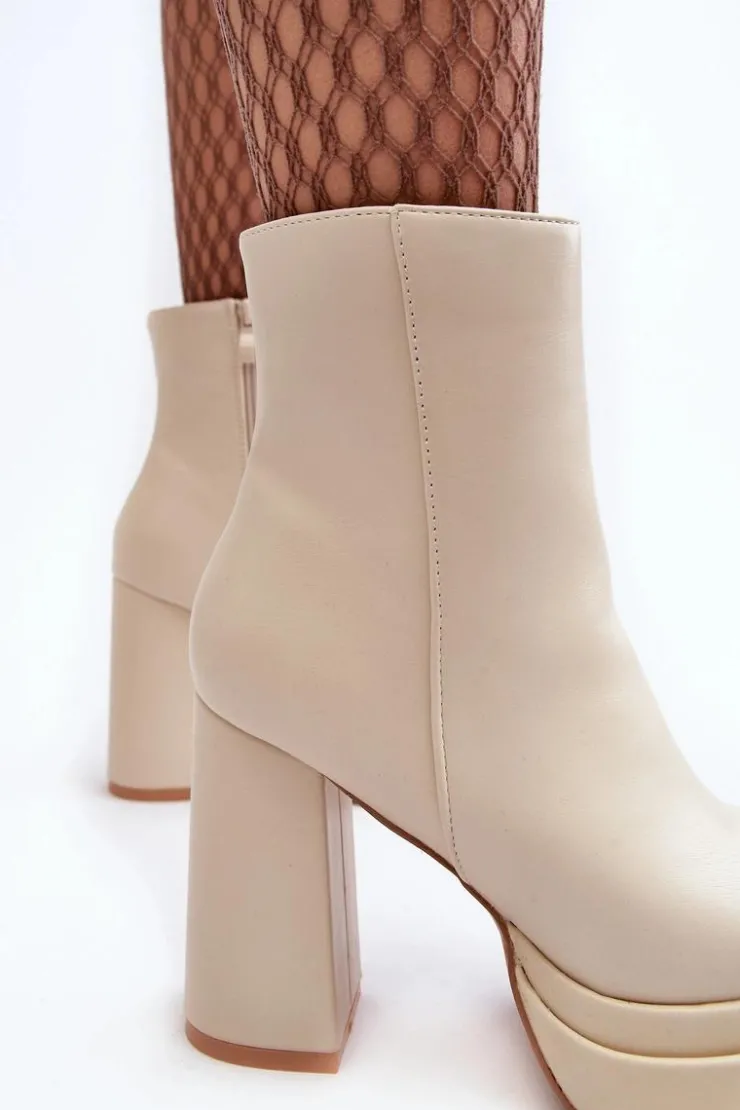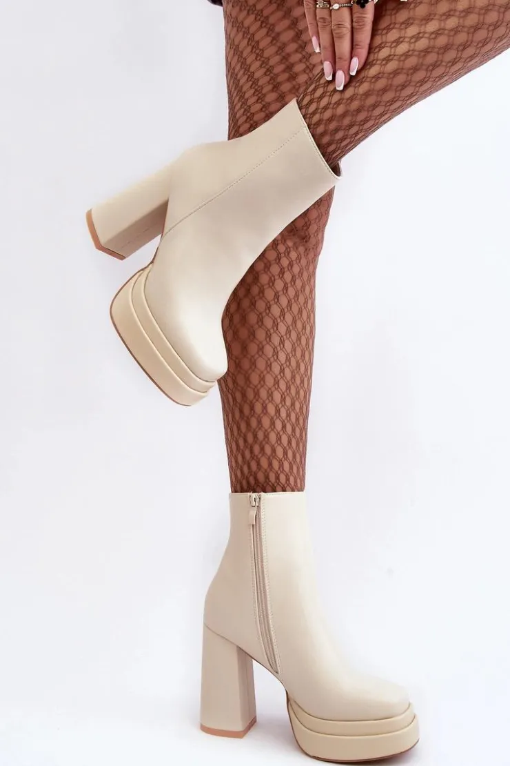 Masywne botki damskie wykonane z eko skóry. Osadzone na wysokim obcasie w postaci słupka i platformie. Noski w kwadrat. Zapiętek jest usztywniony. Model ten zapinany jest na suwak z boku. Botki te doskonale sprawdzą się w jesiennych stylizacjach. Przy wyborze rozmiaru prosimy kierować się tabelą rozmiarów