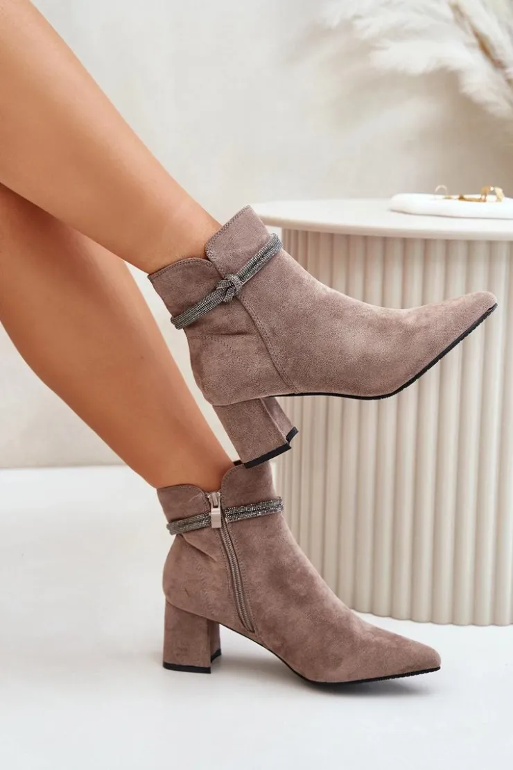 Botki damskie z cholewką sięgającą za kostkę. Wykonane z miłego w dotyku eko zamszu. Osadzone na obcasie w formie słupka. Cholewka ozdobiona błyszczącym paseczkiem. Noski w szpic optycznie wysmuklą nogi. Zapięcie na zamek gwarantuje łatwe zakładanie i zdejmowanie butów, co jest szczególnie praktyczne w codziennym użytkowaniu. Przy wyborze rozmiaru prosimy sugerować się tabelą rozmiarów.