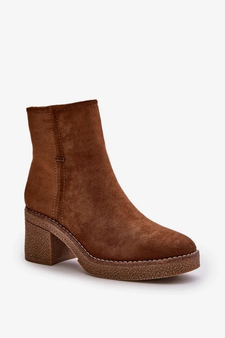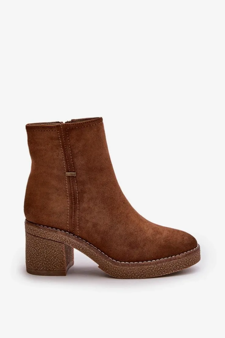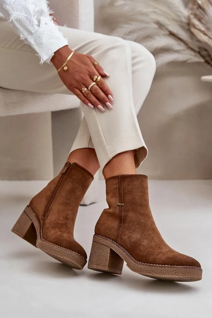 Damskie botki z eko zamszu, który jest miękki i przyjemny w dotyku. Osadzone na stabilnym obcasie w formie słupka, co zapewnia wygodę i pewność chodzenia przez cały dzień, jednocześnie dodając kilka centymetrów wzrostu i podkreślając sylwetkę. Wnętrze ocieplone jest kocem obuwniczym, który zapewnia ciepło i komfort w chłodniejsze dni, chroniąc stopy przed zimnem. Dzięki zapięciu na zamek, ich zakładanie i zdejmowanie jest szybkie i bezproblemowe, co jest dużym atutem w codziennym użytkowaniu. Przy wyborze rozmiaru prosimy sugerować się tabelą rozmiarów.