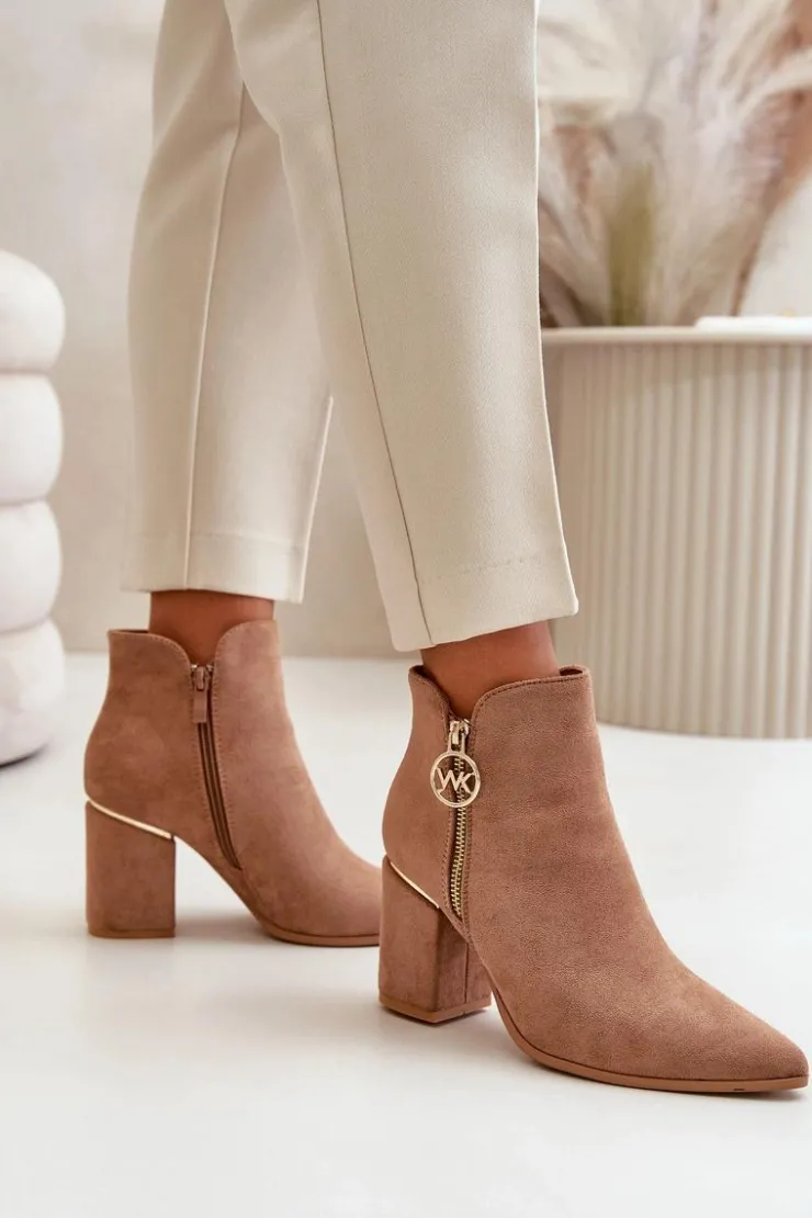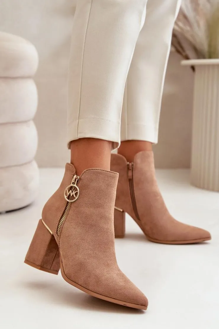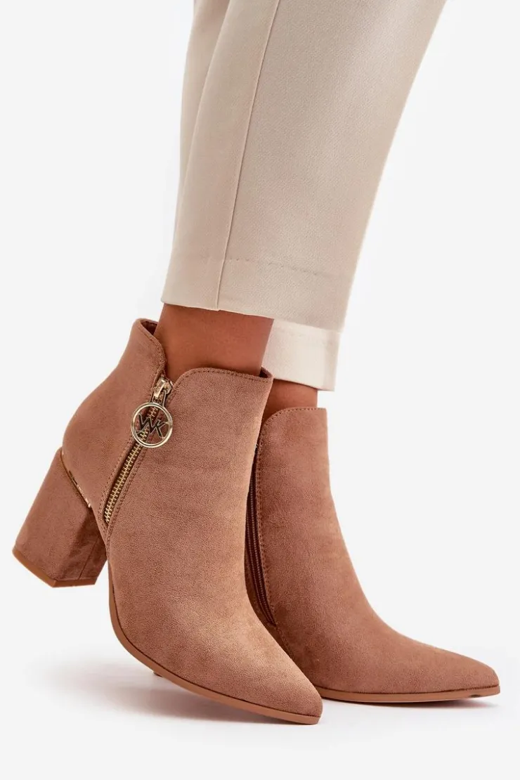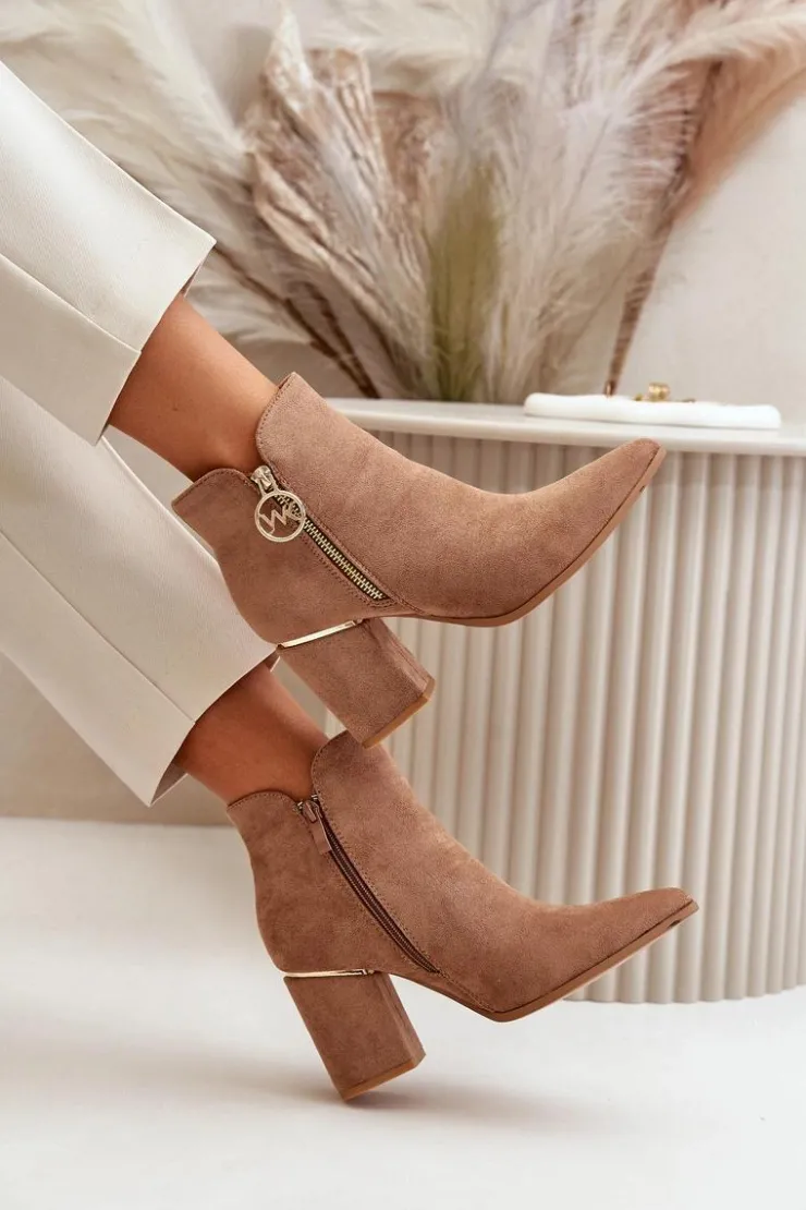 Eleganckie botki z eko zamszu, osadzone na obcasie typu słupek. Wyróżniają się spiczastymi noskami, które nadają im szyku. Wnętrze jest ocieplone, zapewniając komfort w chłodniejsze dni. Zapinane na zamek z boku, dodatkowo ozdobione złotym zamkiem, co dodaje wyjątkowego stylu. Przy wyborze rozmiaru prosimy sugerować się tabelą rozmiarów.