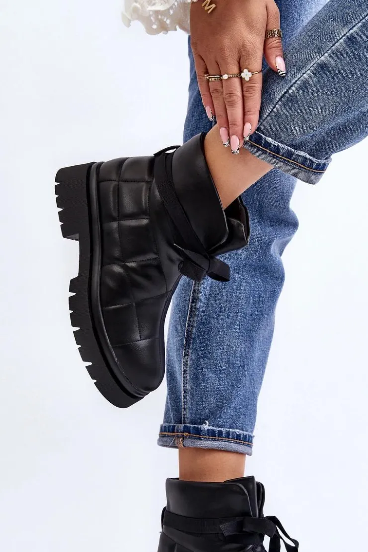 Ciepłe i modne botki wykonane z eko skóry. Osadzone na płaskim, stabilnym obcasie. Model wsuwany, z cholewką za kostkę. Środek ocieplony futerkiem. Cholewka ozdobiona pikowaniem. Dodatkowo zapiętek jest usztywniony. Idealne na chłodne dni! Przy wyborze rozmiaru prosimy sugerować się tabelą rozmiarów.