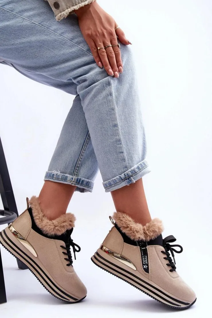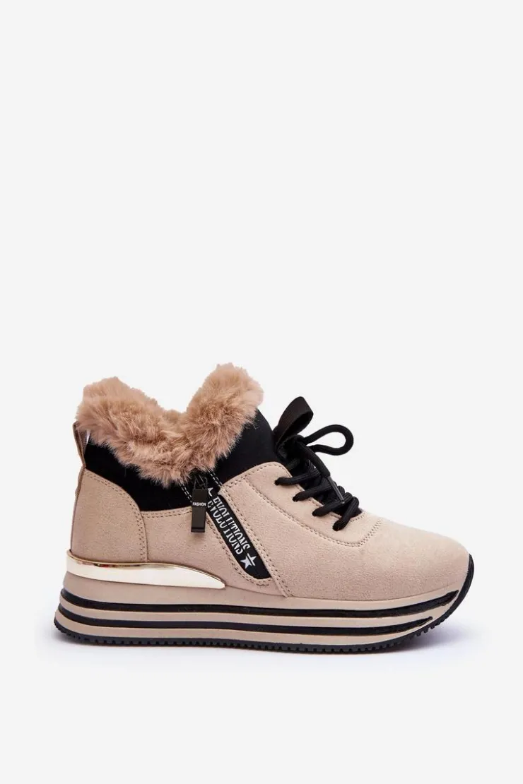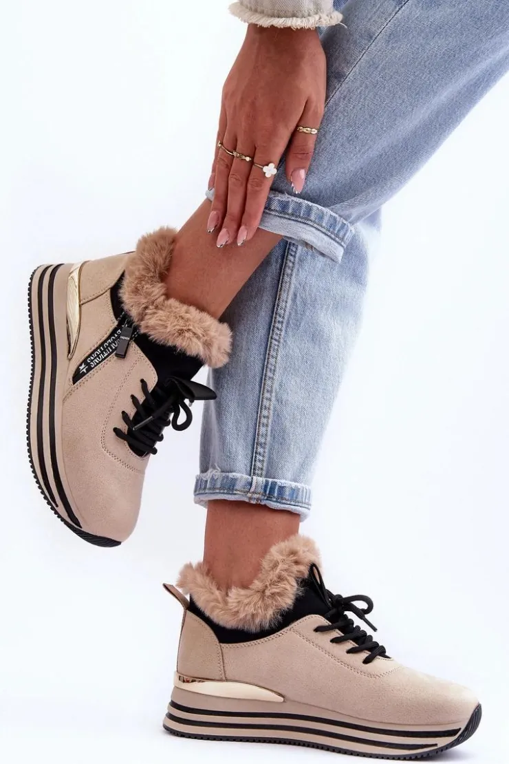 Buty sportowe damskie zostały wykonane z eko zamszu. Model osadzony na platformie z lustrzanym elementem z tyłu. Zapinane na suwak po zewnętrznej stronie cholewki i dodatkowo sznurowane. Miękka wkładka zapewni komfortowe użytkowanie obuwia. Góra cholewki ozdobiona jest futerkiem. Wewnątrz buty ocieplone zostały kocem obuwniczym. Przy wyborze rozmiaru prosimy kierować się tabelą rozmiarów.