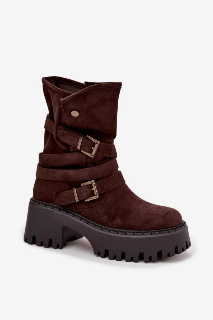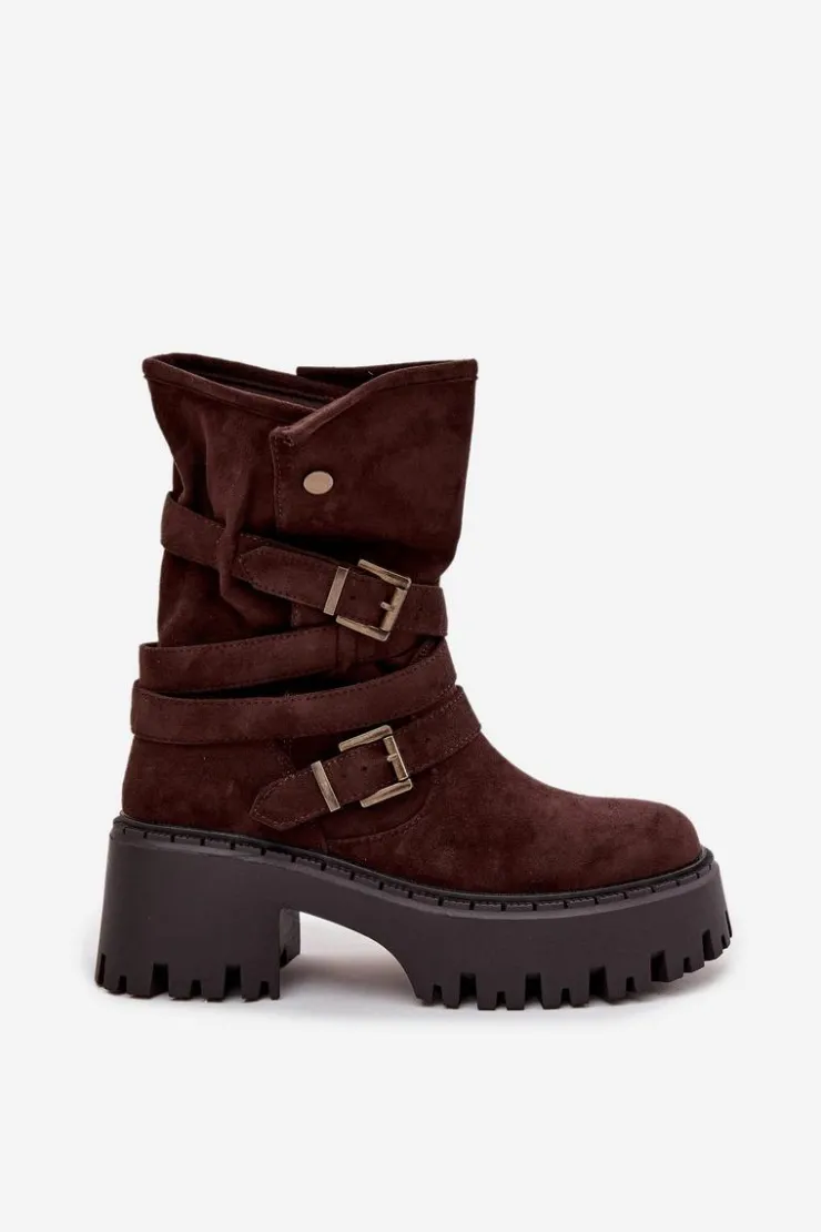 Botki damskie wykonane z eko zamszu. Osadzone na masywnym obcasie, który zapewni stabilność na każdym kroku. Noski zaokrąglone. Model ten wyróżnia się paskiem oplecionym wokół cholewki ze złotymi klamrami. Góra cholewki zapinana na dwa zatrzaski. Bez względu na okazję, te botki będą doskonałym uzupełnieniem Twojej garderoby! Przy wyborze rozmiaru prosimy sugerować się tabelą rozmiarów.