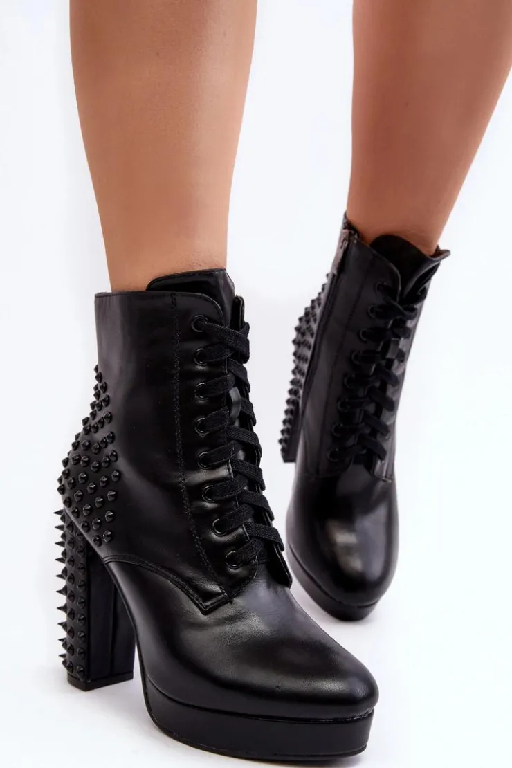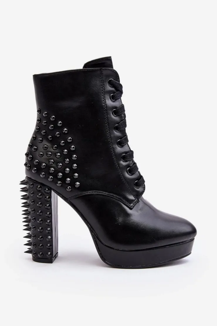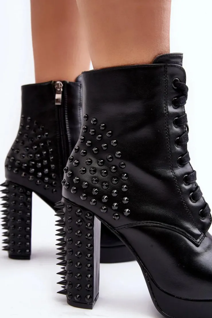 Botki damskie wykonane ze skóry ekologicznej. Cholewka oraz obcas są ozdobione ćwiekami, które dodają im wyjątkowego charakteru. Obcas w formie wysokiego słupka i platforma nadają modny i stylowy wygląd. Nie czekaj, aż znikną. Zrób wrażenie nie tylko na sobie, ale również na innych! Przy wyborze rozmiaru prosimy kierować się tabelą rozmiarów