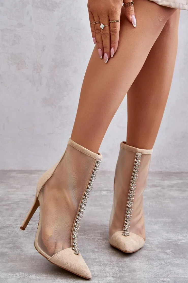 Botki z siateczką. Piękne botki zostały wykonane z połączenia eko zamszu oraz siateczkowego materiału. Model osadzony na obcasie w postaci szpilki, z noskiem w szpic optycznie wysmukli nogi. Cholewka została ozdobiona na przodzie mieniącymi się dżetami imitującymi cyrkonie. Botki są zapinane z tyłu na suwak. Zapiętek w tych botkach jest usztywniany. Model ten idealnie będzie prezentować się z eleganckimi stylizacjami! Przy wyborze rozmiaru prosimy sugerować się tabelą rozmiarów. Botki z siateczką!