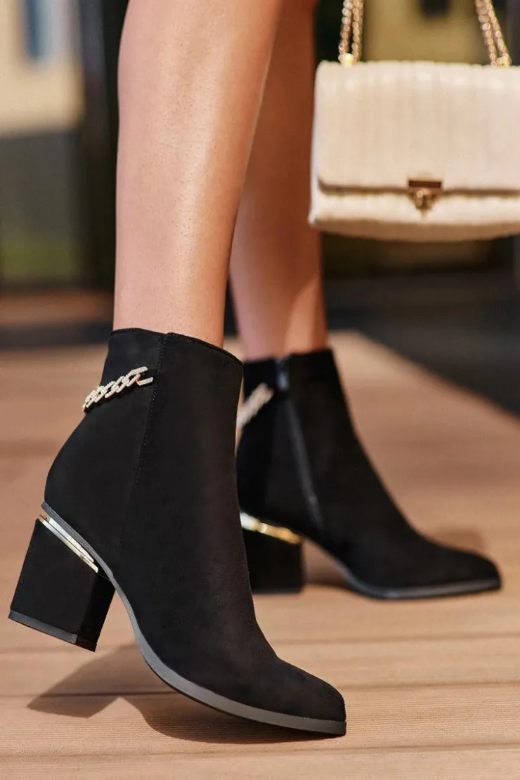 Eleganckie botki za kostkę zostały wykonane z miłego w dotyku eko zamszu. Osadzone na obcasie z lustrzanym elementem. Na cholewce biżuteryjna ozdoba. Model zapinany jest na suwak. Zapiętek usztywniony, wnętrze ocieplone kocem obuwniczym. Przy wyborze rozmiaru prosimy sugerować się tabelą rozmiarów.