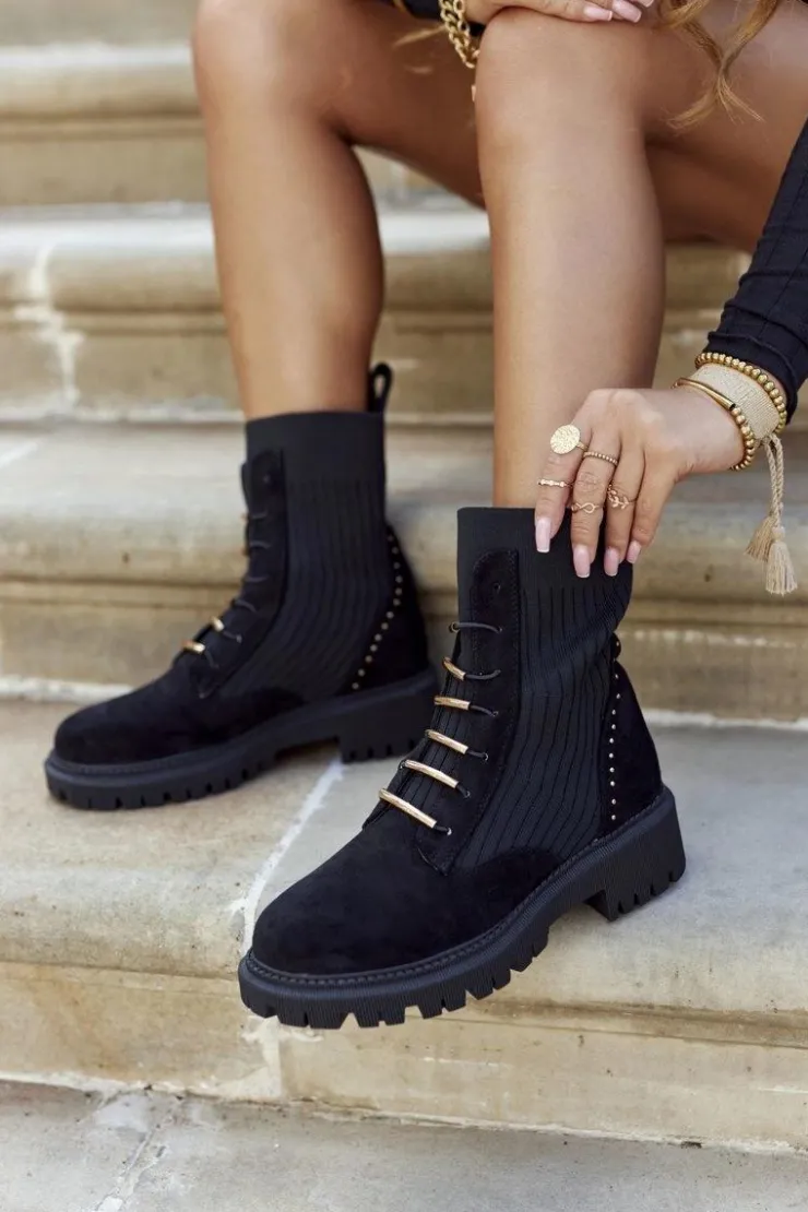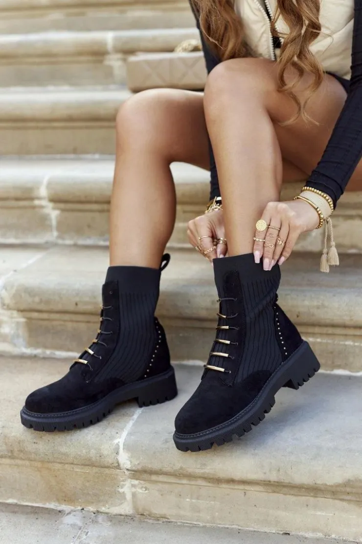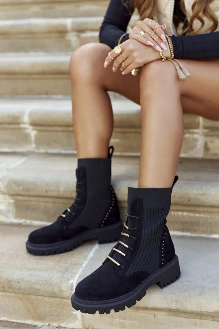 Modne botki, które są hitem tego sezonu! Wierzch wykonany z ekologicznej skóry zamszowej. Wysoka, rozciągliwa cholewka typu skarpeta, zapewni idealne dopasowanie oraz ułatwi zakładanie. Złote dodatki pięknie podkreślają ich wyjątkowość. Przy wyborze rozmiaru prosimy sugerować się tabelą rozmiarów.