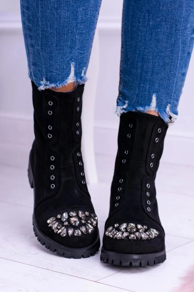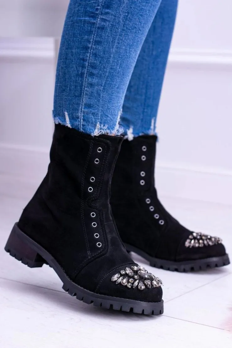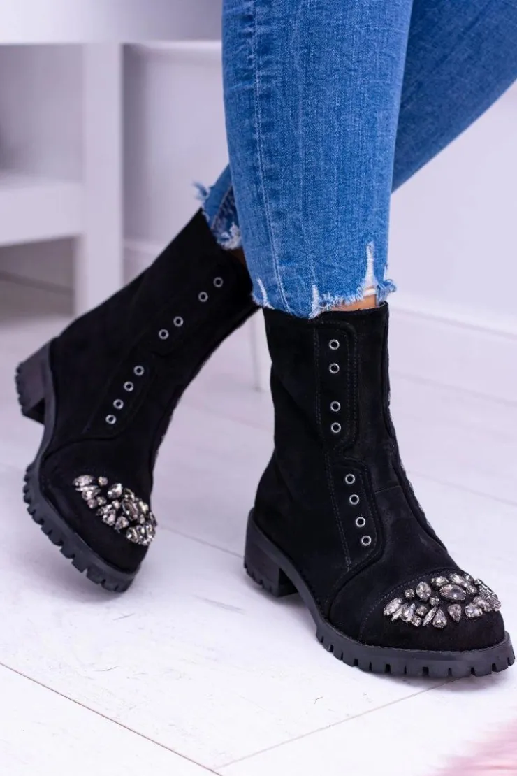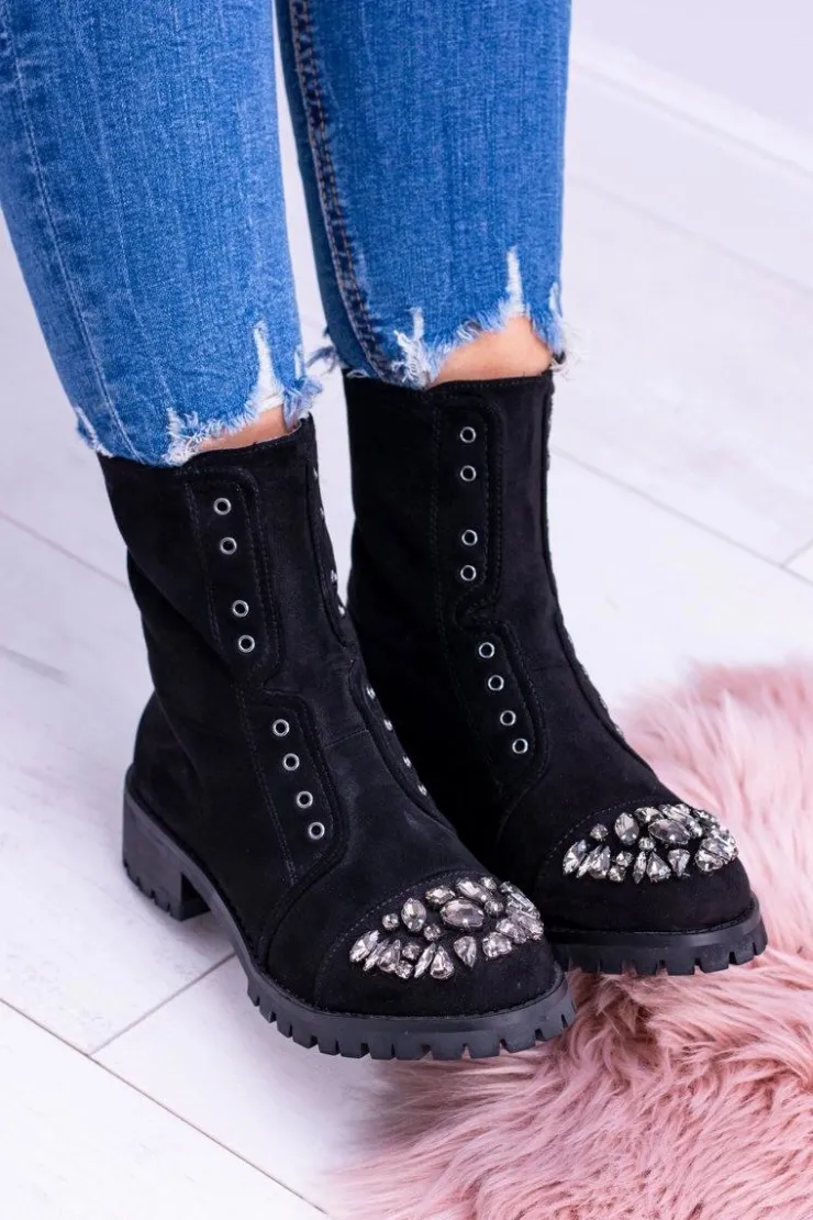 Boto Czarne Botki|Botki Płaskie*Lu Boo | Czarne Damskie Botki Za Kostkę Cyrkonie Zamsz Carrie