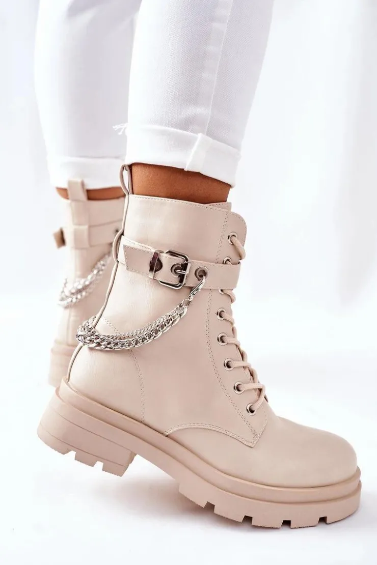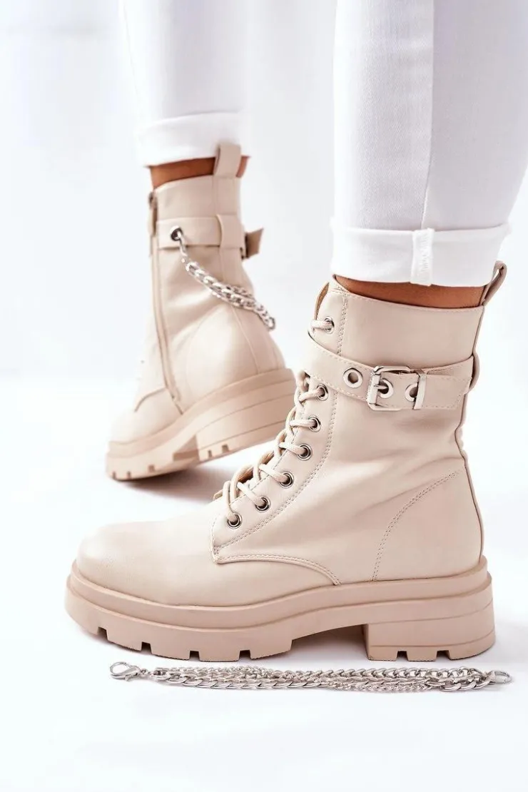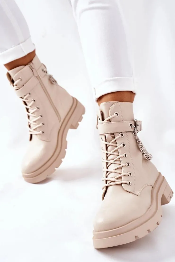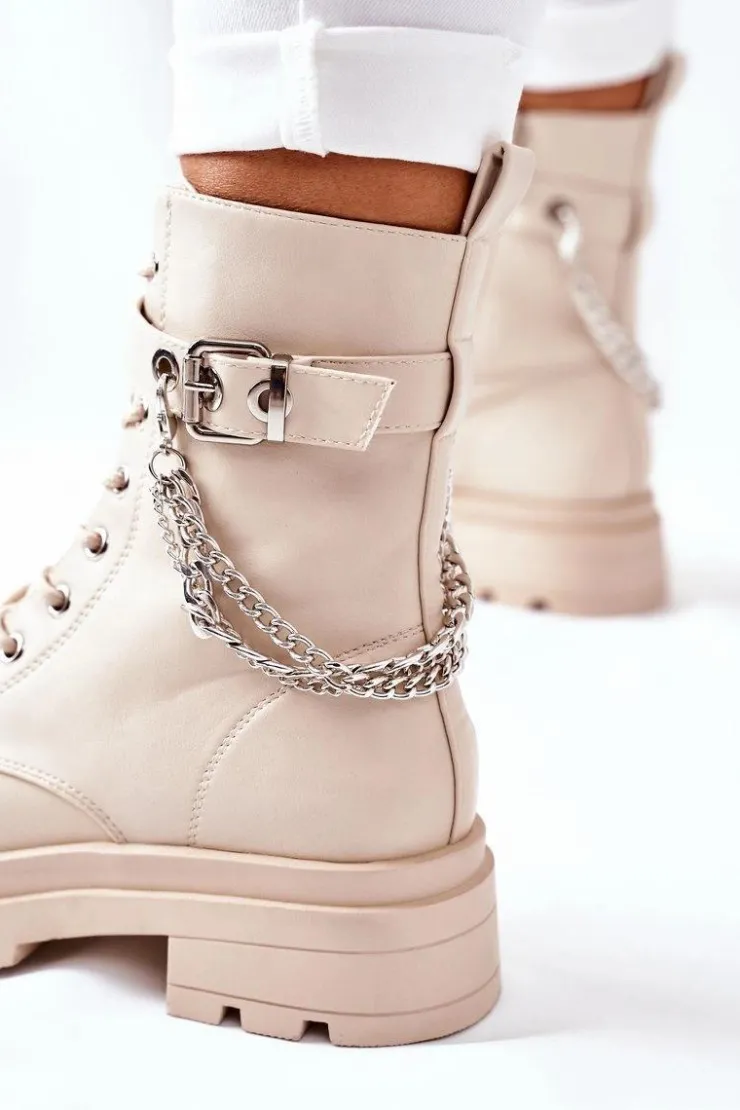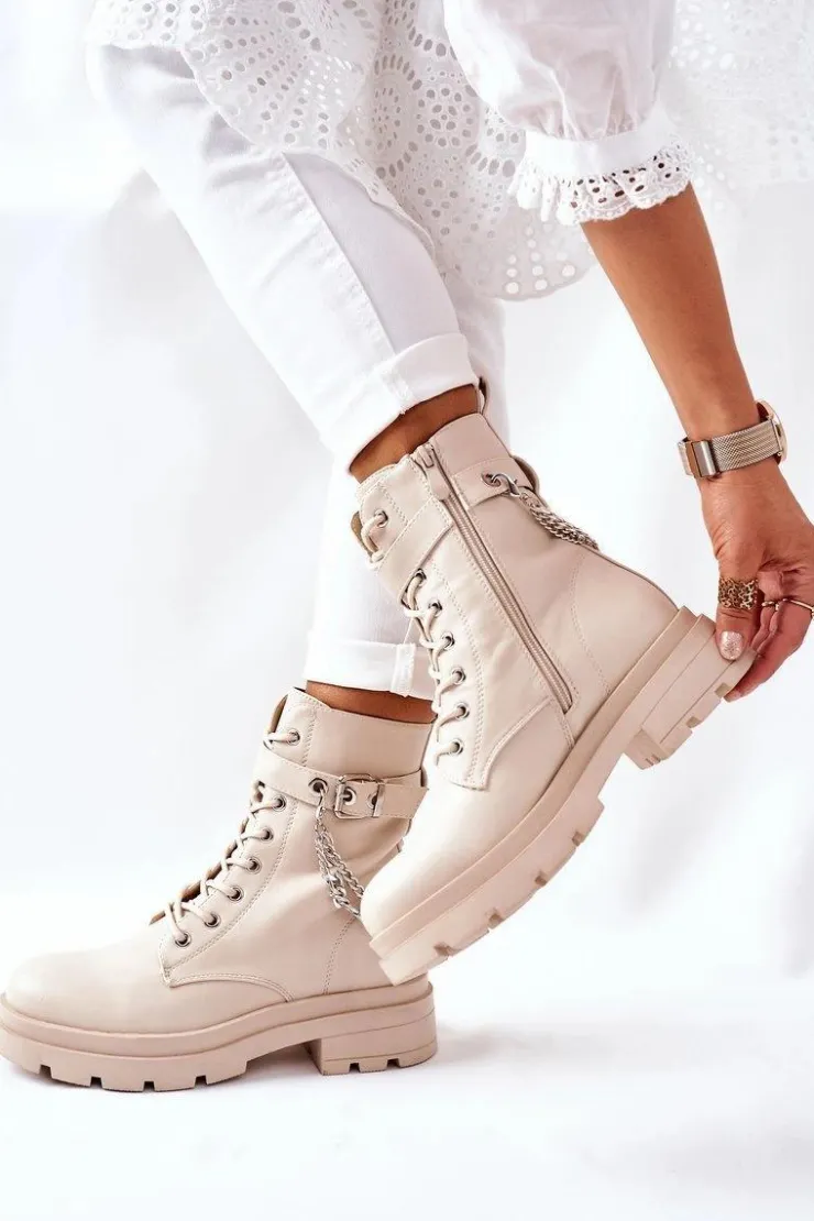 Niezwykłe i stylowe botki wykonane ze skóry ekologicznej. Zapinane na zamek oraz klamrę. Dodatkowy ozdobny łańcuch na cholewce. Przy wyborze rozmiaru prosimy sugerować się tabelą rozmiarów.