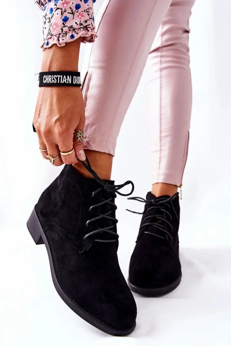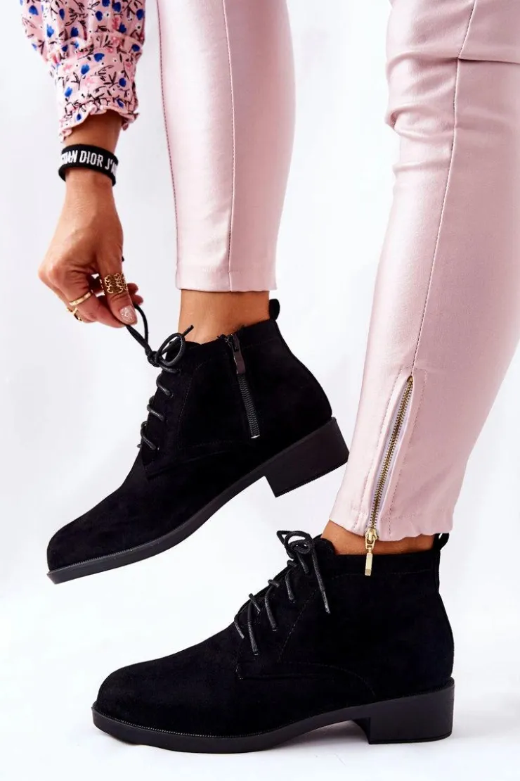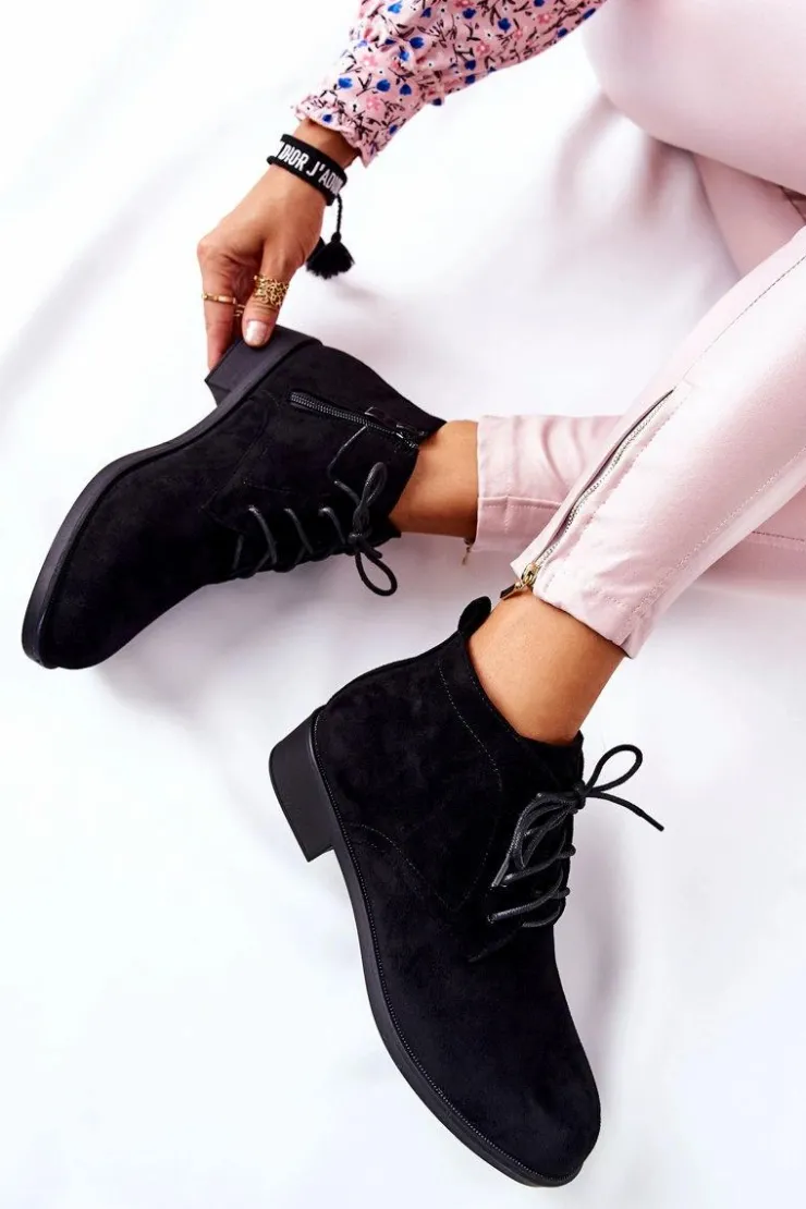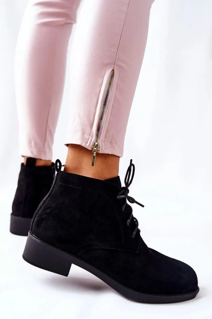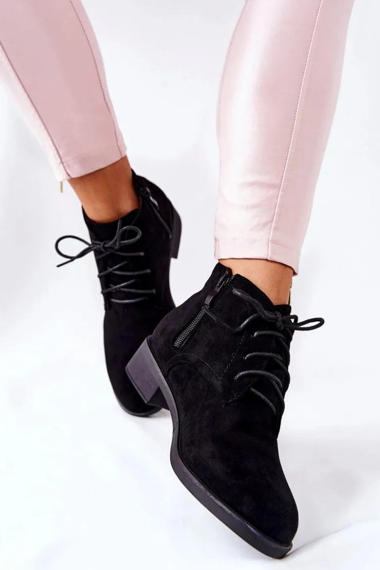 Piękne botki wykonane z eko zamszu. Posiadają wiązanie w kolorze obuwia oraz suwak ułatwiający zakładanie obuwia. Całość w środku jest ocieplona kocem obuwniczym. Płaski, niski obcas zapewni stabilność oraz komfort podczas długich spacerów. Sprawdź koniecznie naszą ofertę botków! Przy wyborze rozmiaru prosimy sugerować się tabelą rozmiarów.