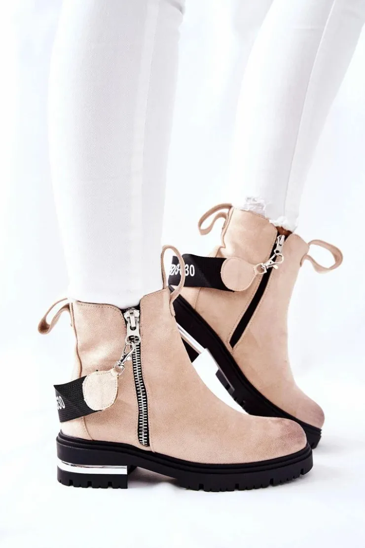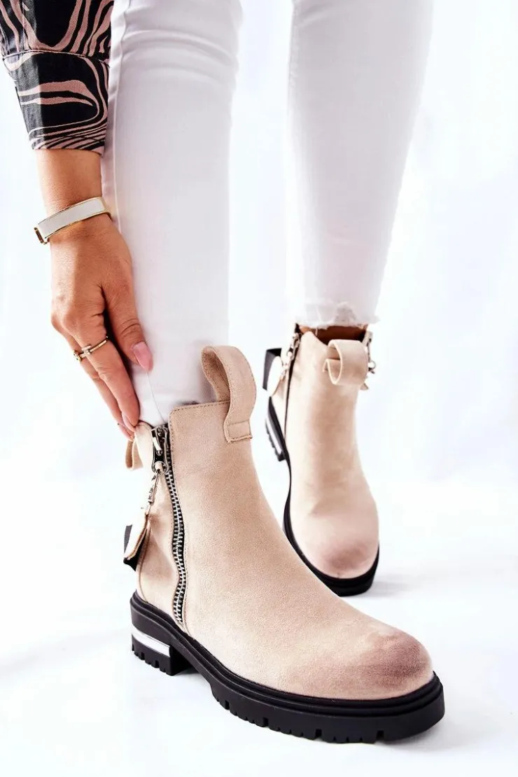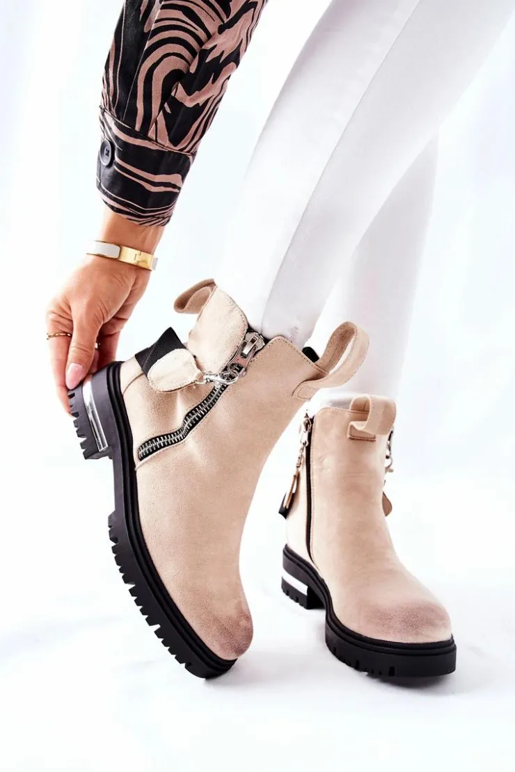 Botki damskie wykonane z eko zamszu. Wnętrze ocieplone jest miłym w dotyku kocem obuwniczym. Przy wyborze rozmiaru prosimy sugerować się tabelą rozmiarów.
