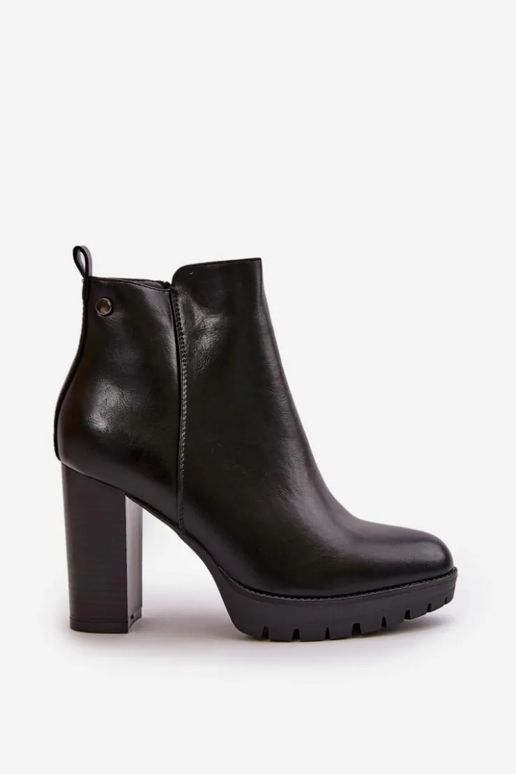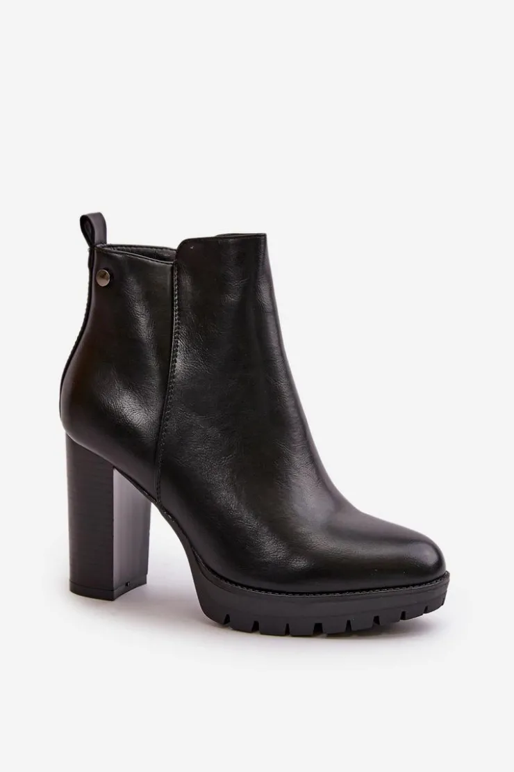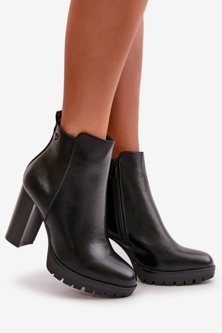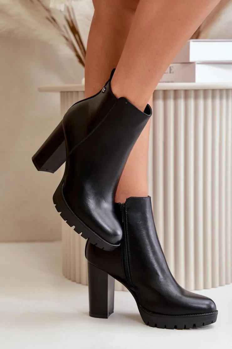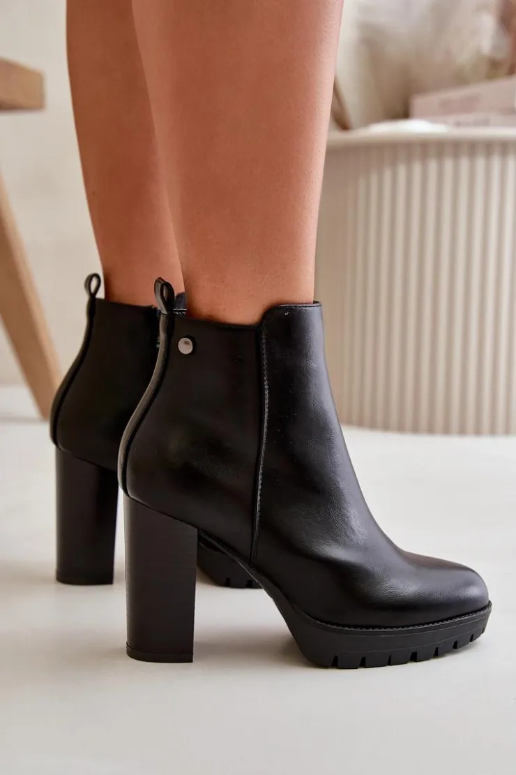 Damskie botki wykonane z eko skóry. Osadzone na wysokim obcasie w postaci słupka. Środek ocieplony kocem obuwniczym zapewnia komfort w chłodniejsze dni. Zapinane na zamek. Doskonałe do jesiennych stylizacji. Przy wyborze rozmiaru prosimy sugerować się tabelą rozmiarów.