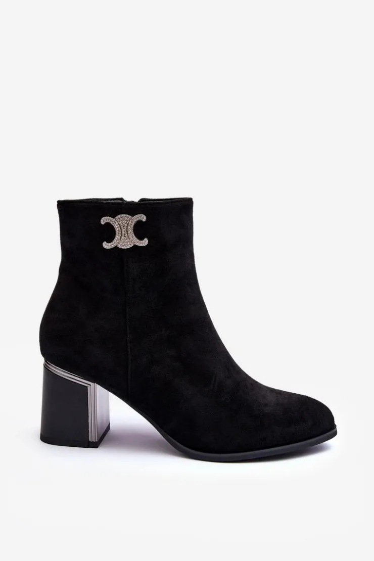 Damskie botki z cholewką za kostkę. Wykonane z miłego w dotyku eko zamszu. Osadzone na obcasie w postaci stabilnego słupka. Zapinane na suwak po wewnętrznej stronie. Na obcasie znajduje się lustrzany element oraz biżuteryjna ozdoba na górze cholewki. Zapiętek usztywniony, wnętrze ocieplone kocem obuwniczym. Przy wyborze rozmiaru prosimy sugerować się tabelą rozmiarów.