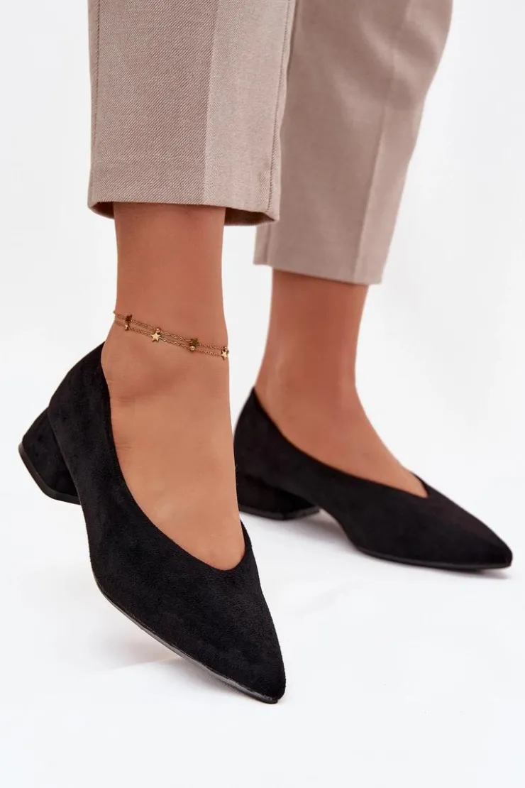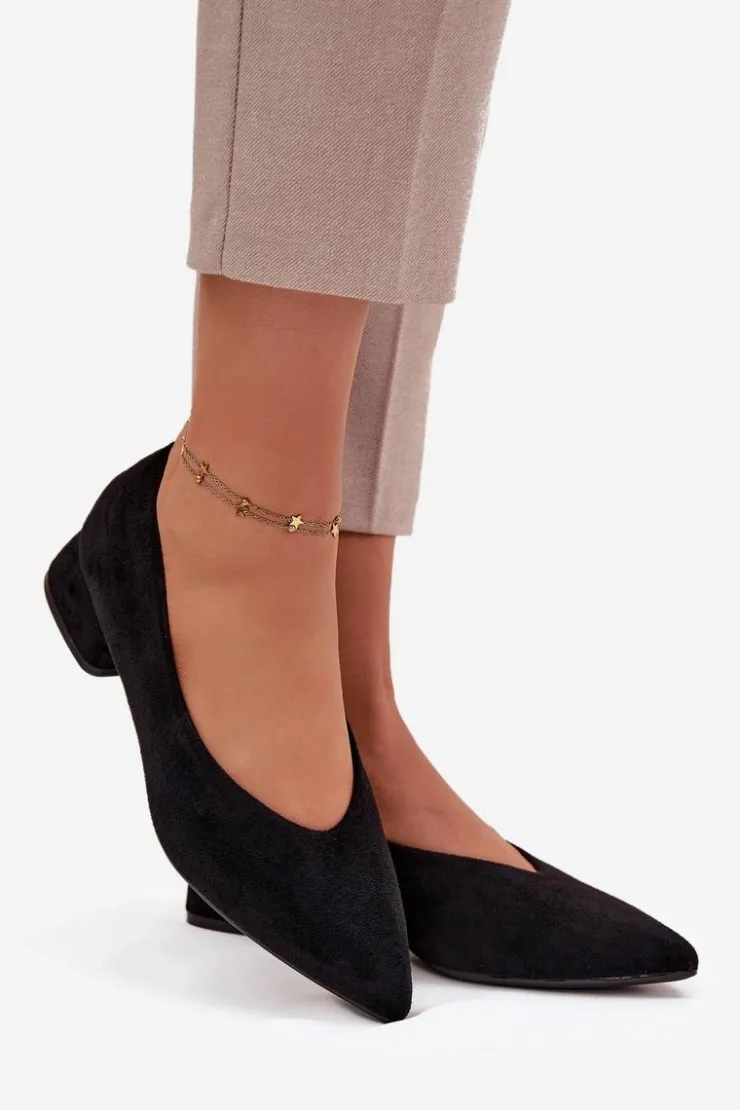 Czółenka wykonane z miękkiego eko zamszu to idealny wybór dla kobiet ceniących elegancję i komfort. Model na niskim, stabilnym obcasie typu klocek zapewnia wygodę nawet podczas długiego dnia, a szpiczasty nosek dodaje butom klasy i optycznie wysmukla nogi. Te uniwersalne czółenka doskonale sprawdzą się zarówno na specjalne okazje, jak i do pracy czy na wieczorne wyjścia. Świetnie komponują się ze spódnicami, sukienkami oraz eleganckimi spodniami, tworząc stylowy i kobiecy look. Przy wyborze rozmiaru prosimy sugerować się tabelą rozmiarów.
