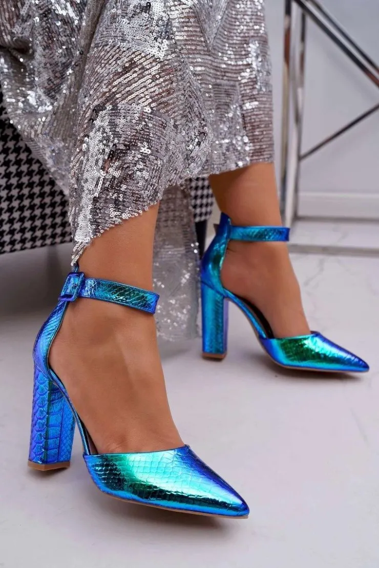 Boto Czółenka Na Słupku*Czółenka Damskie Na Słupku Opalizujące Niebieskie Magnetic