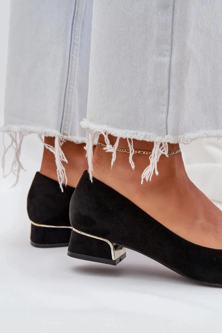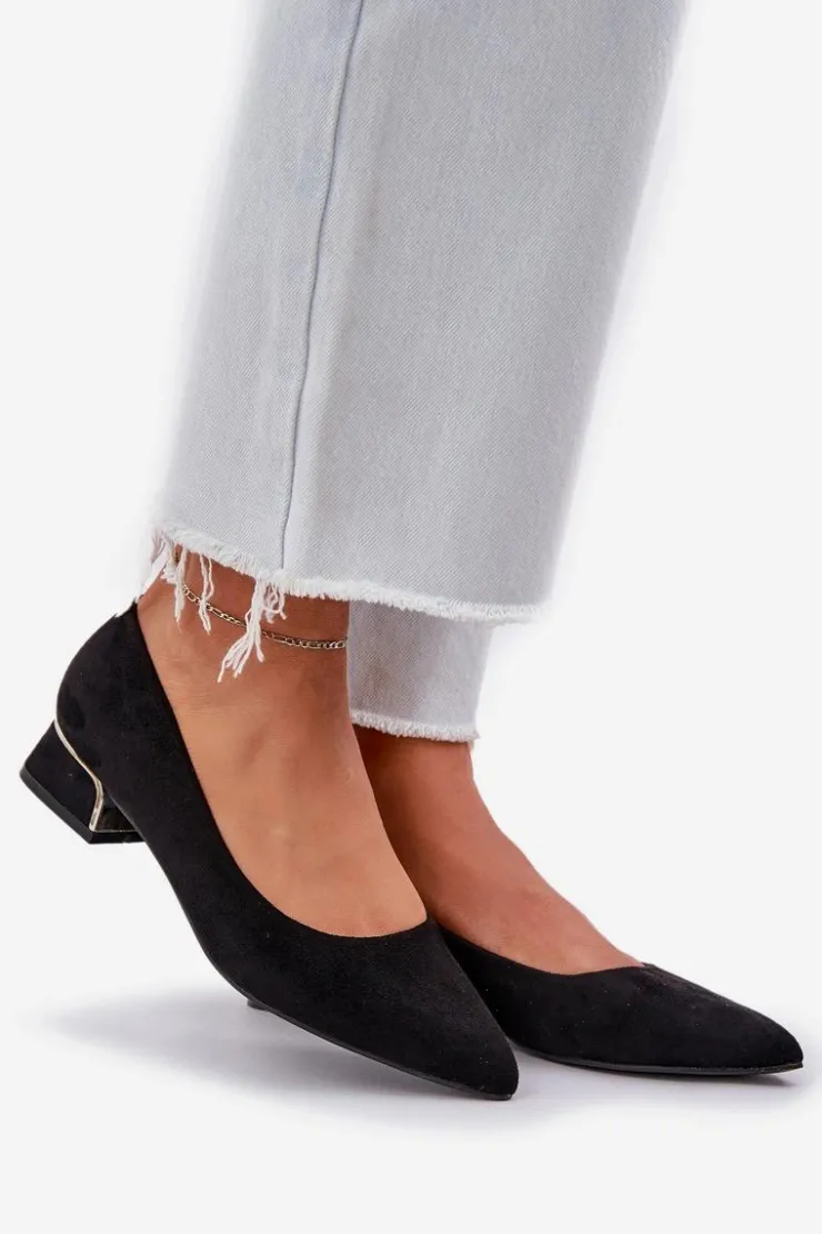 Eko zamszowe czółenka na niskim obcasie to elegancka propozycja dla kobiet ceniących komfort i styl. Szpiczaste noski nadają im wyrafinowanego charakteru, a złoty element na obcasie dodaje subtelnego blasku i podkreśla całość. Niski obcas zapewnia wygodę przez cały dzień, idealnie komponując się zarówno z codziennymi, jak i bardziej eleganckimi stylizacjami. To idealny wybór na każdą okazję, łączący nowoczesny design z klasyczną elegancją. Przy wyborze rozmiaru prosimy sugerować się tabelą rozmiarów.