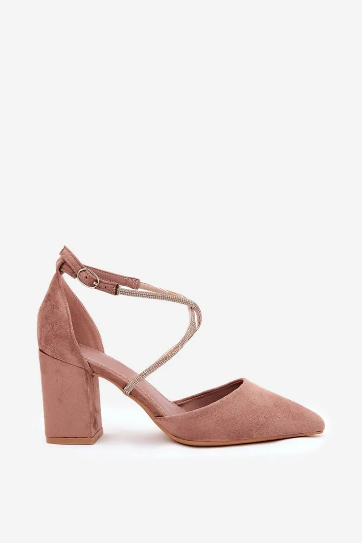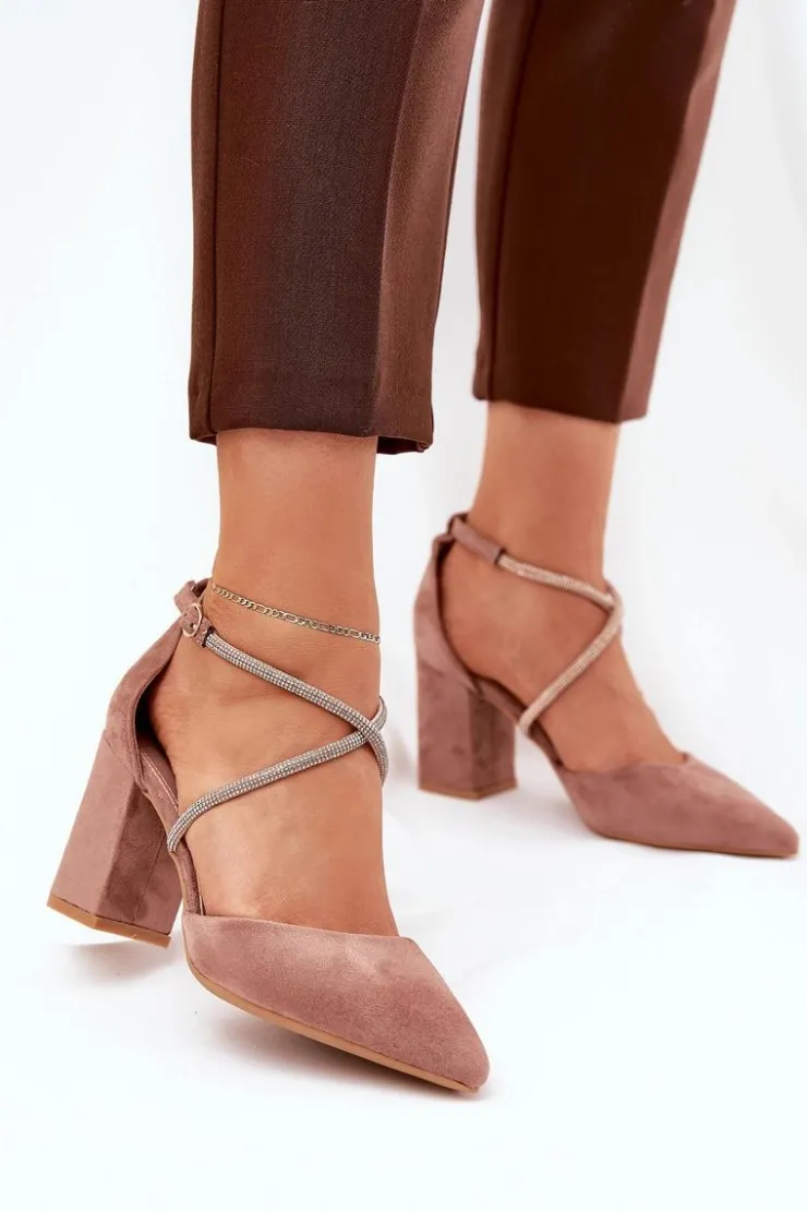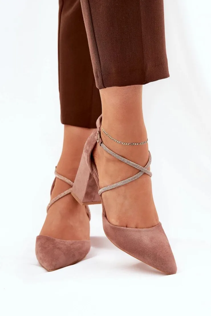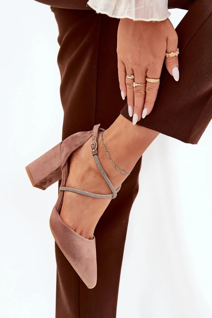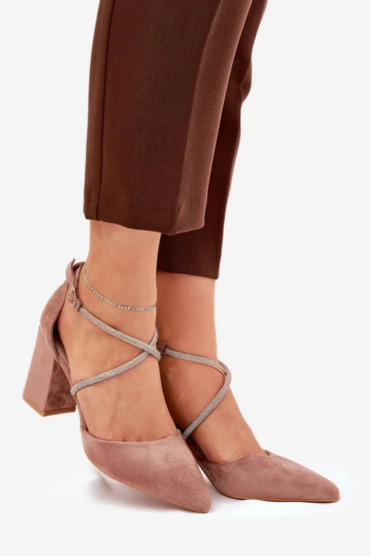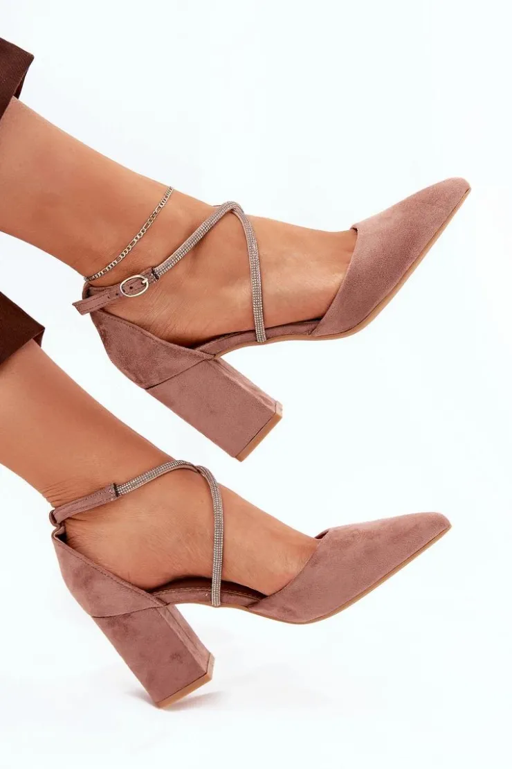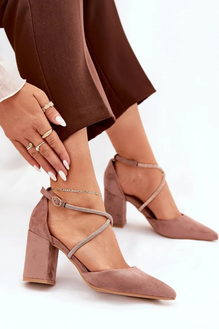 Czółenka damskie wykonane z eko zamszu. Osadzone na obcasie typu słupek. Model ten wyróżnia się przeplatającymi paseczkami, które ozdobione zostały cyrkoniami, które z pewnością przyciągną uwagę i nadają wyjątkowego blasku. Noski w szpic podkreślają ich elegancki wygląd, a zapinane na sprzączkę, zapewniają idealne dopasowanie do stopy. Te czółenka będą doskonałym wyborem na specjalne okazje, dodając każdej stylizacji szyku i odrobiny glamour. Przy wyborze rozmiaru prosimy sugerować się tabelą rozmiarów.