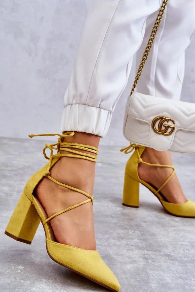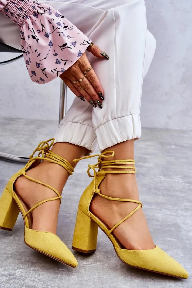 Klasyczne czółenka wykonane z eko skóry. Pięknie prezentują się na nodze. Osadzone na obcasie w postaci stabilnego słupka. Model wiązany wokół łydki. Nosek w szpic. Miękka, wykonana z eko skóry wkładka zapewni komfort na każdym kroku. Te modne czółenka doskonale będą komponować się z wieloma stylizacjami. Przy wyborze rozmiaru prosimy kierować się tabelą rozmiarów