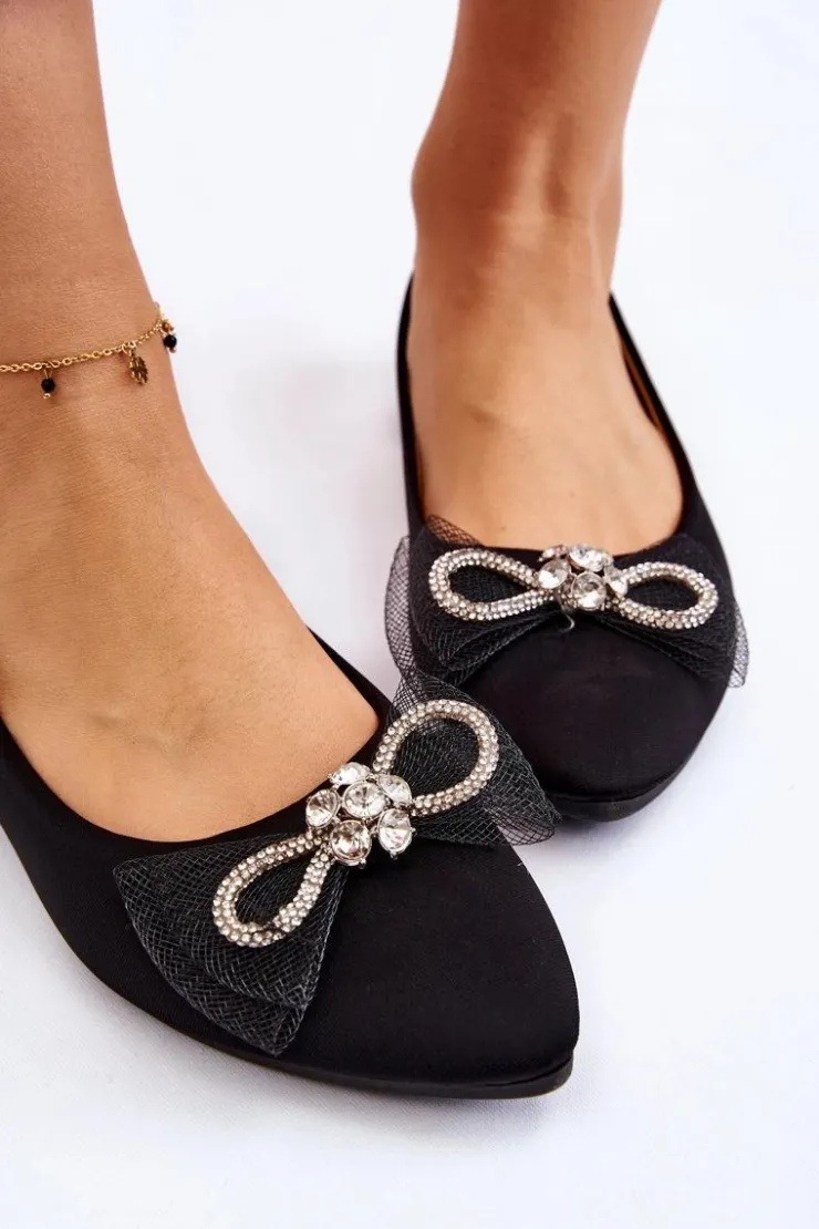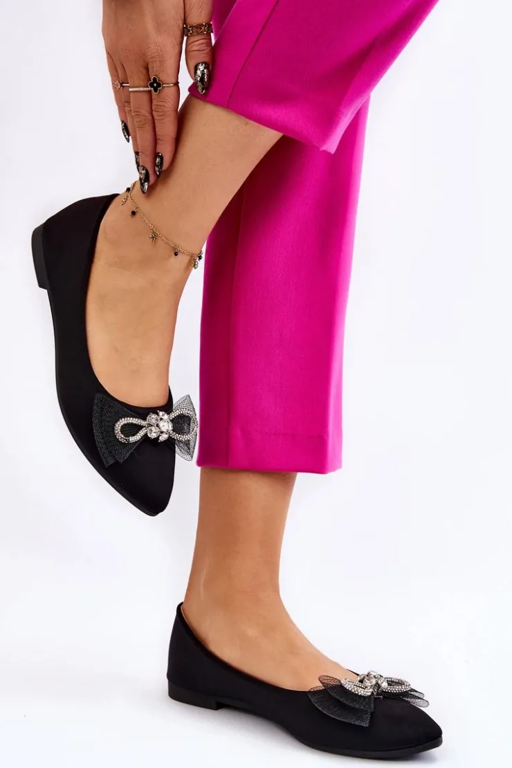 Eleganckie, damskie baleriny zostały wykonane z materiału tekstylnego. Model ten posiada na przodzie kokardę oraz dżety imitujące cyrkonie. Nosek w szpic. Baleriny to buty, z którymi stworzysz mnóstwo stylizacji. Będą idealne na różne, ważne okazje. Miękka wkładka wykonana z eko skóry zapewni wygodę podczas użytkowania. Przy wyborze rozmiaru prosimy sugerować się tabelą rozmiarów.