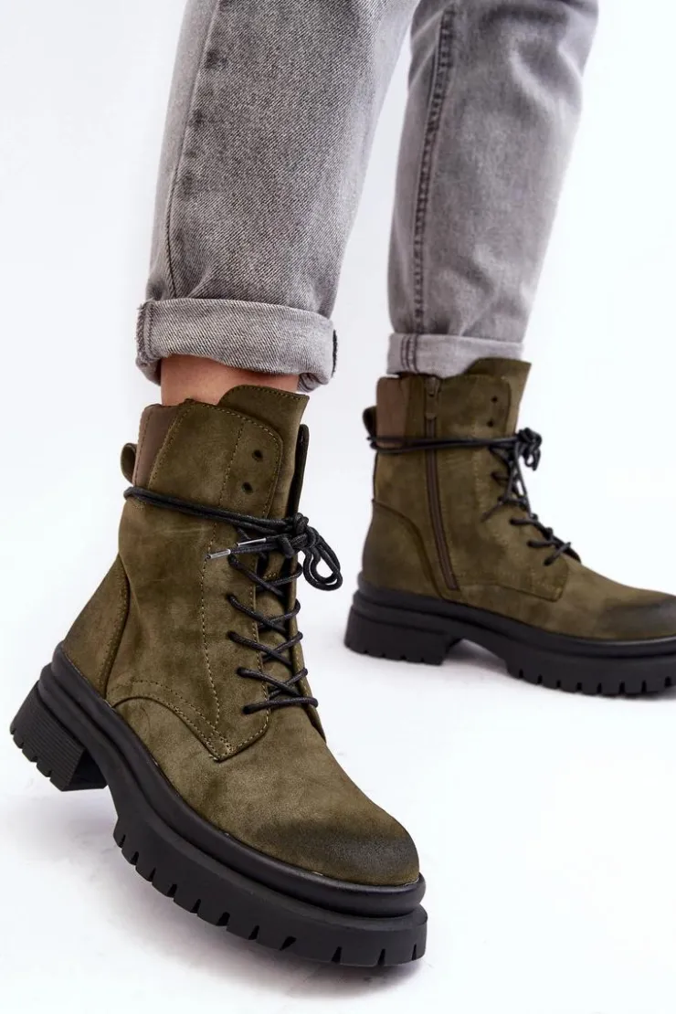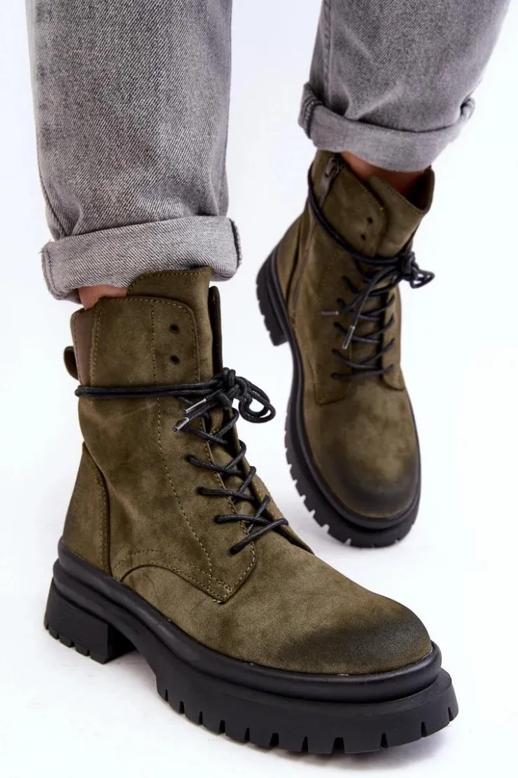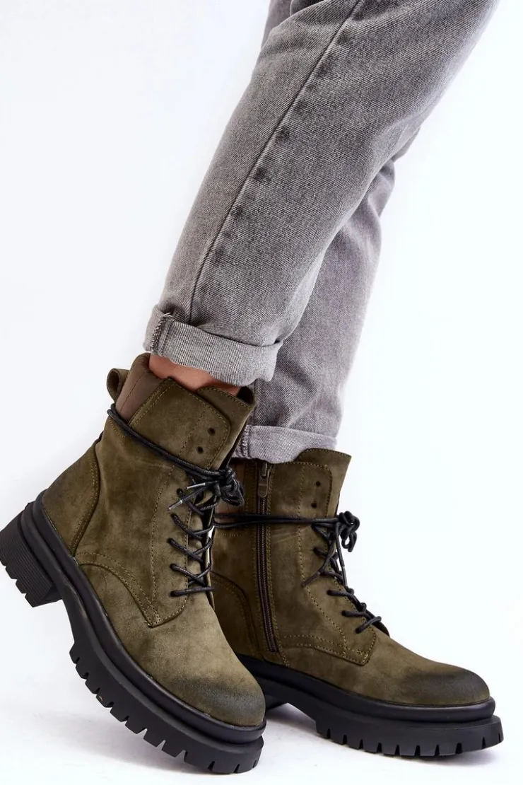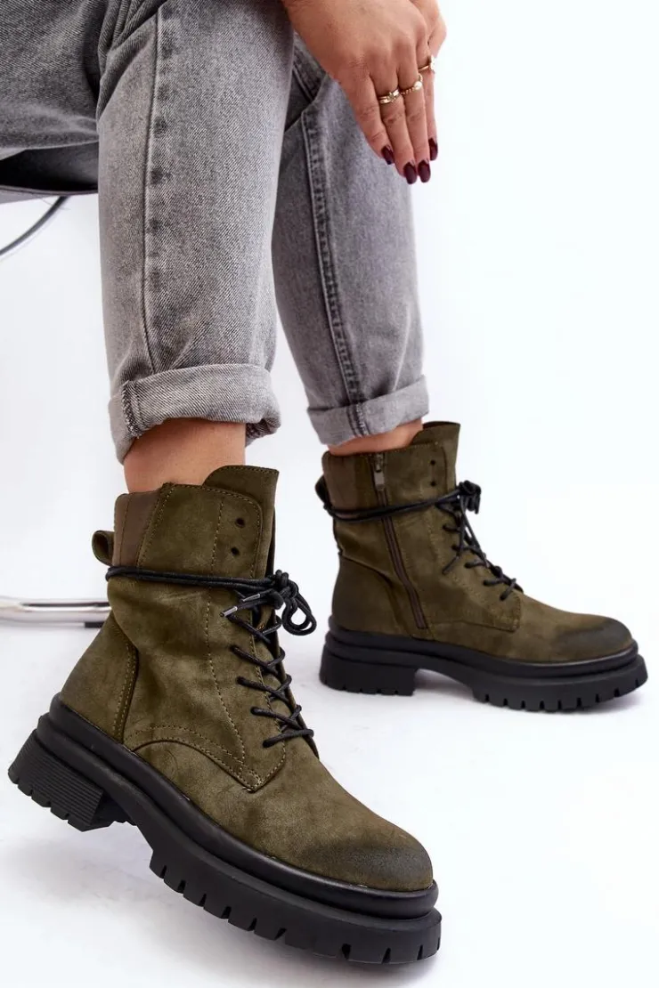 Damskie trapery wykonane z eko skóry. Osadzone na płaskim obcasie i platformie. Noski zaokrąglone. Model ten zapinany jest na suwak z boku oraz dodatkowo posiada sznurowanie. Usztywniony zapiętek zwiększy stabilizacje stopy. Koniecznie powinnaś je mieć! Przy wyborze rozmiaru prosimy sugerować się tabelą rozmiarów.