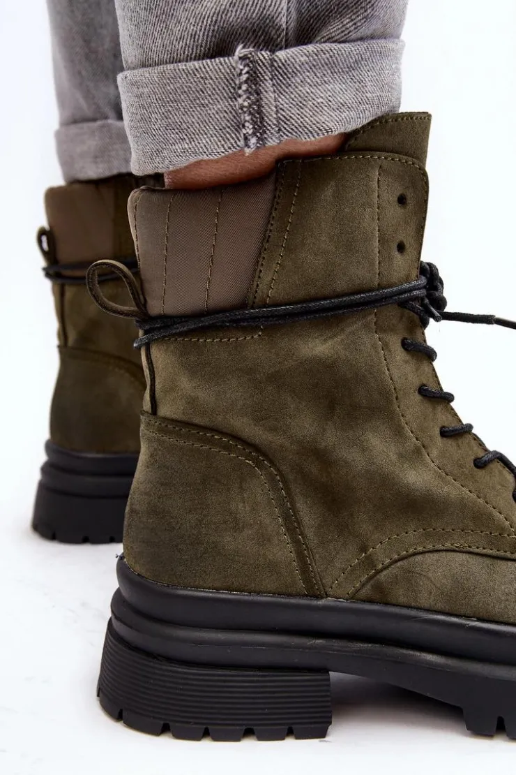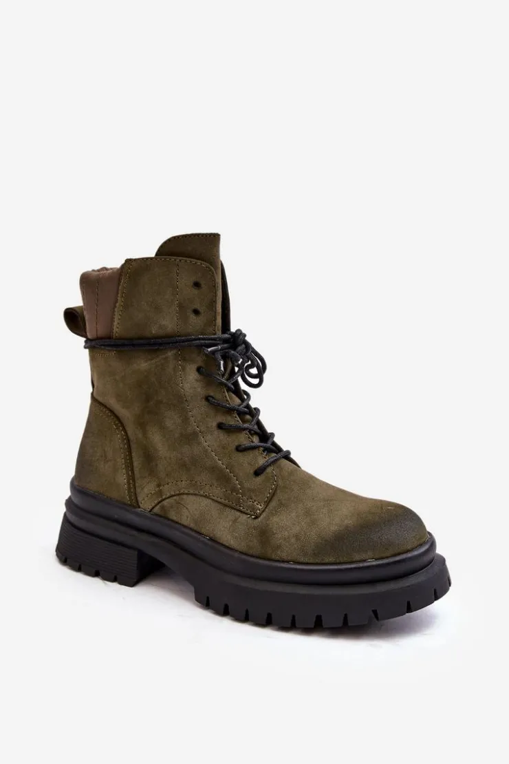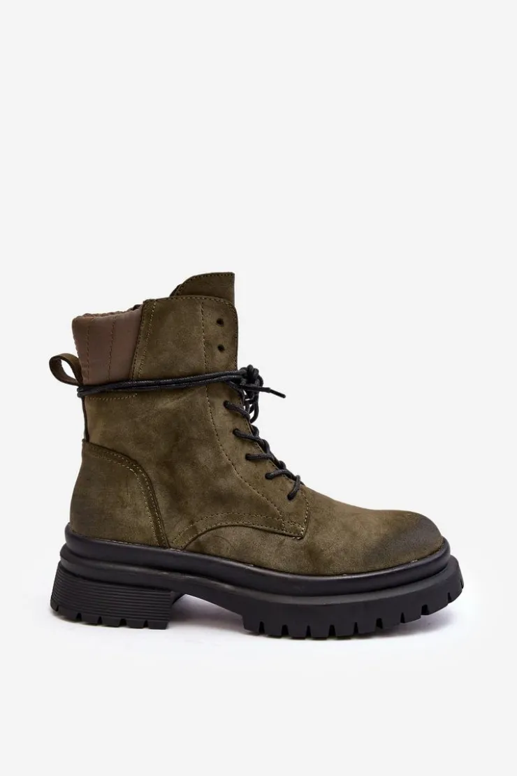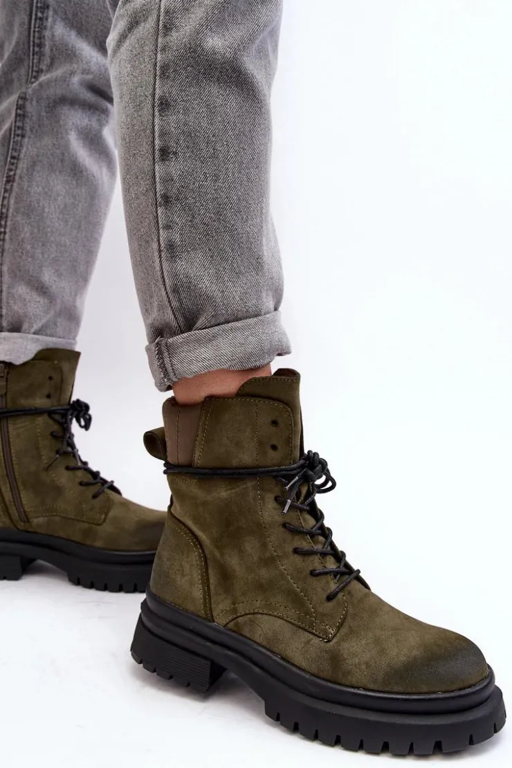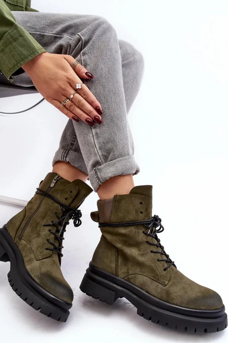 Damskie trapery wykonane z eko skóry. Osadzone na płaskim obcasie i platformie. Noski zaokrąglone. Model ten zapinany jest na suwak z boku oraz dodatkowo posiada sznurowanie. Usztywniony zapiętek zwiększy stabilizacje stopy. Koniecznie powinnaś je mieć! Przy wyborze rozmiaru prosimy sugerować się tabelą rozmiarów.