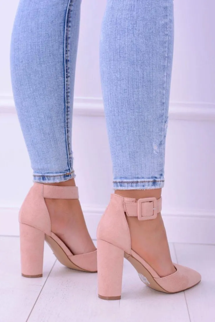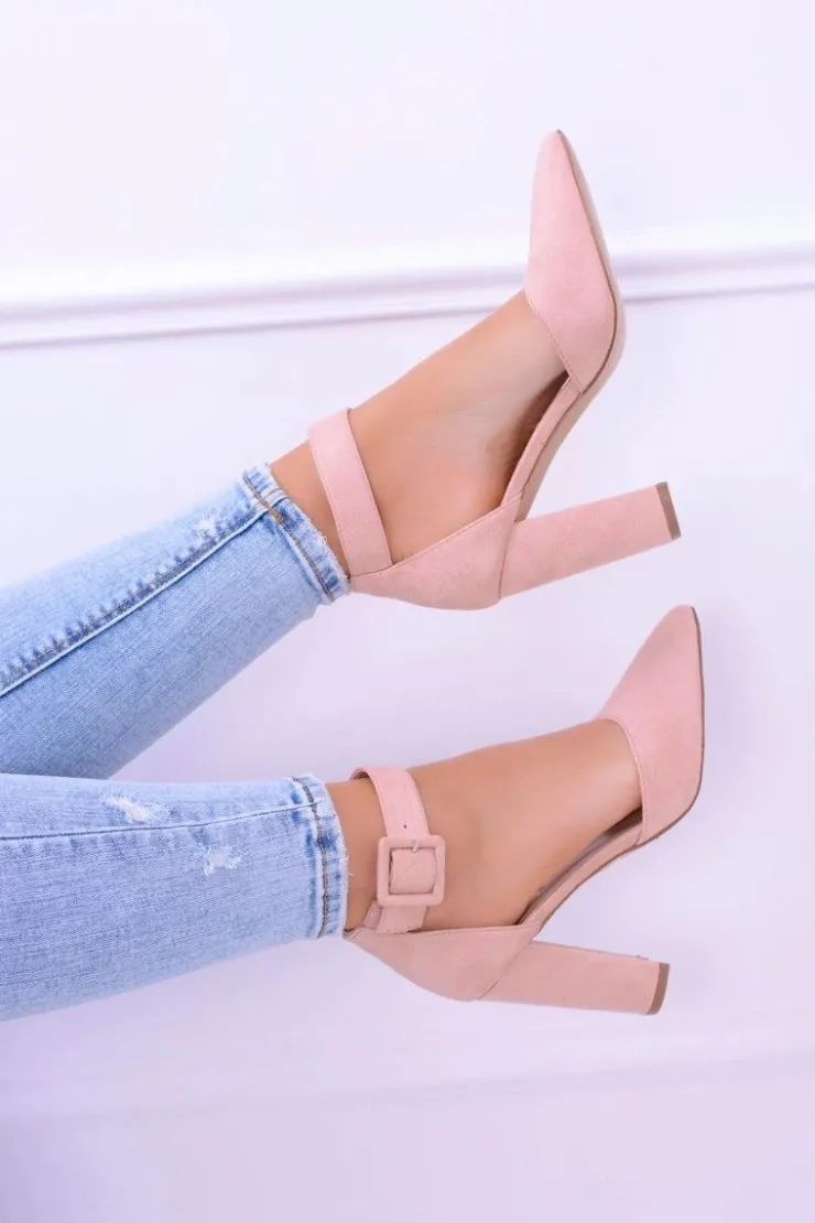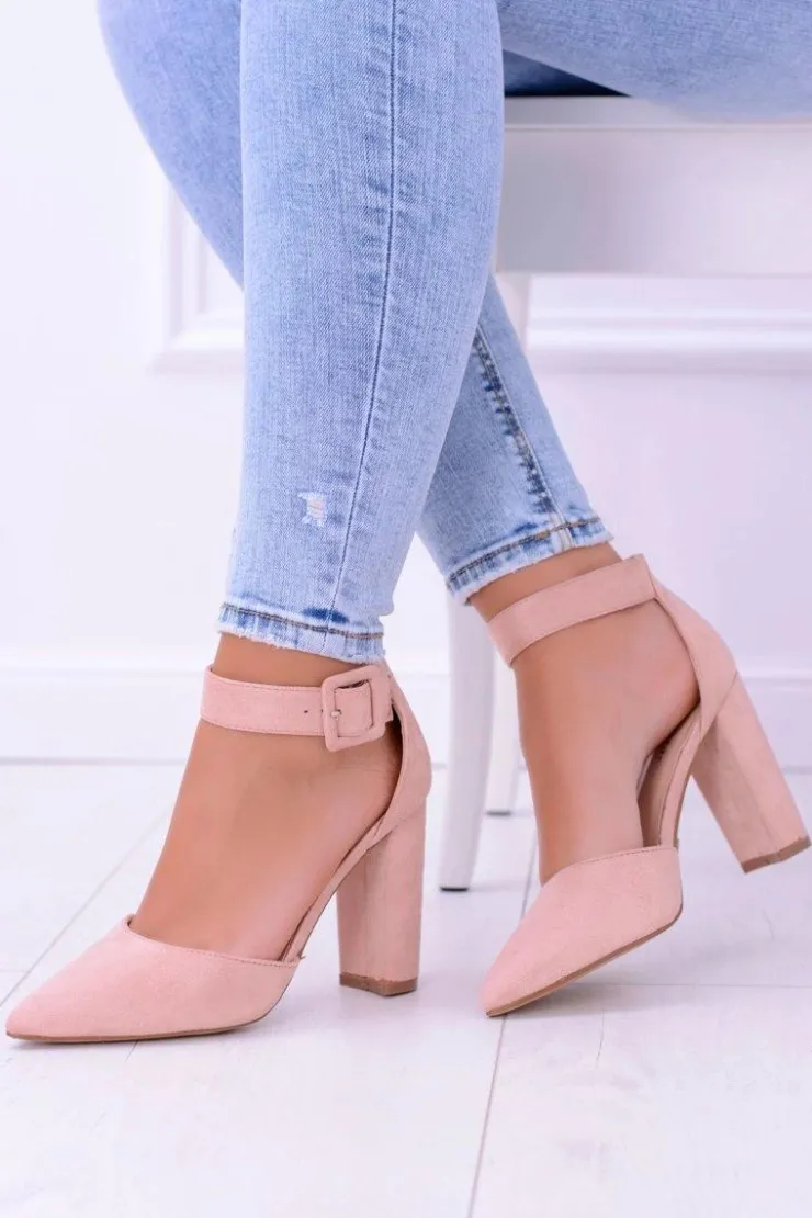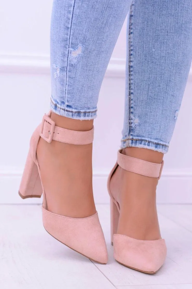 Elegancki i klasyczny model czółenek. Zamszowy materiał oraz wysoki słupek to podstawa dobrego obuwia. Wysokość obcasa wynosi 10 cm. Wkładka wykonana ze skóry ekologicznej w celu zapewnienia większego komfortu. Zapinane na pasek wokół kostki. Idealne na wszelkie okazje.
