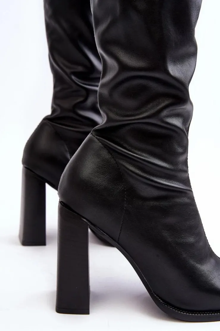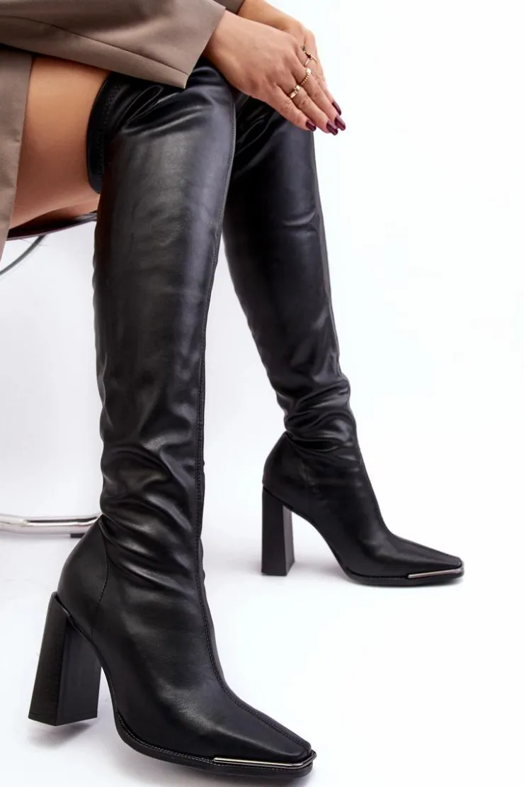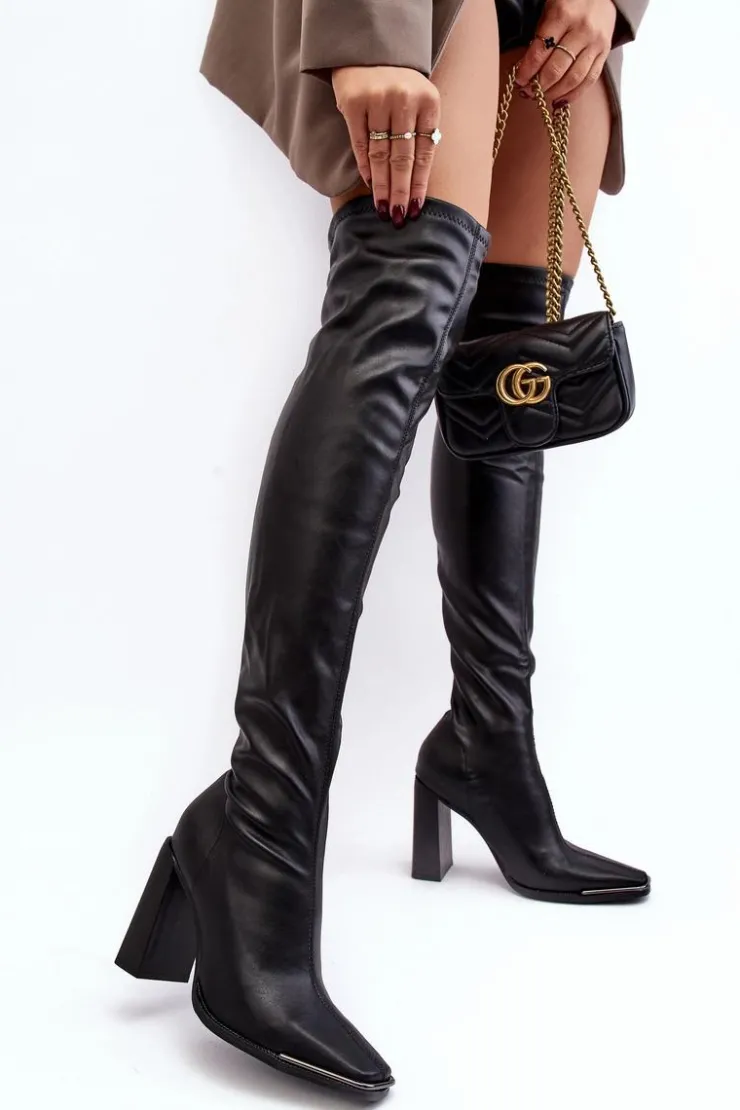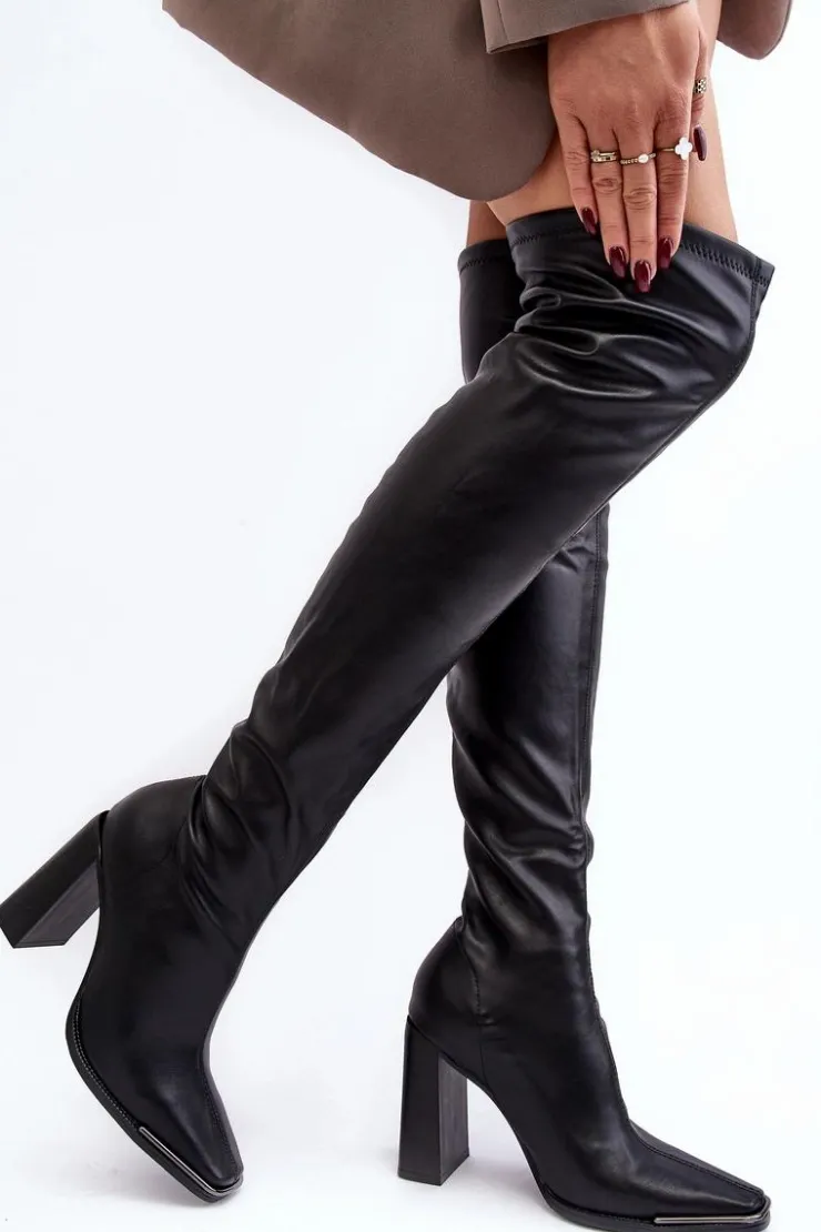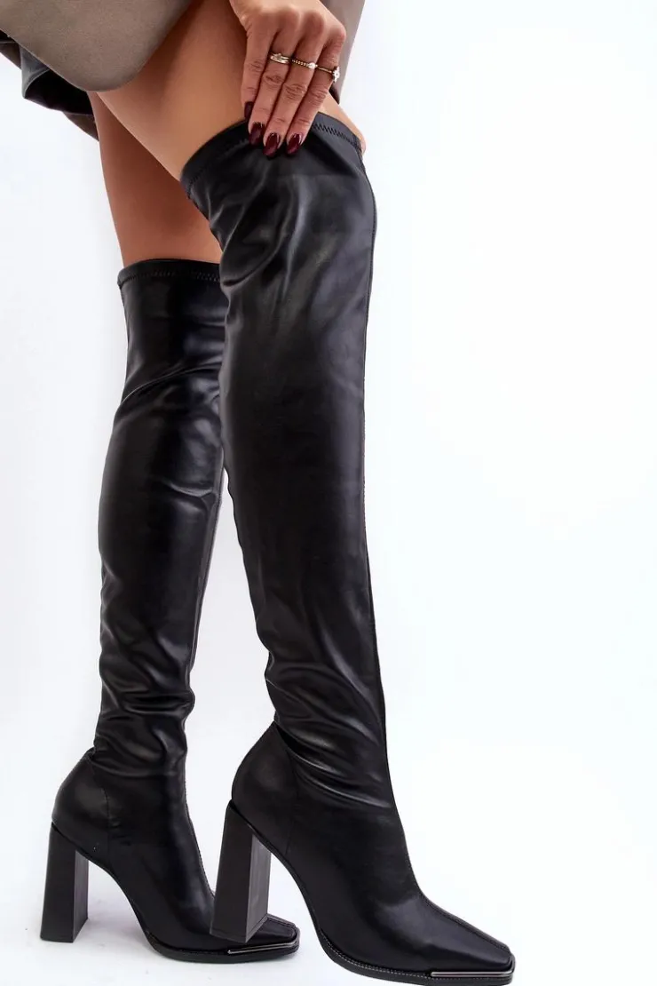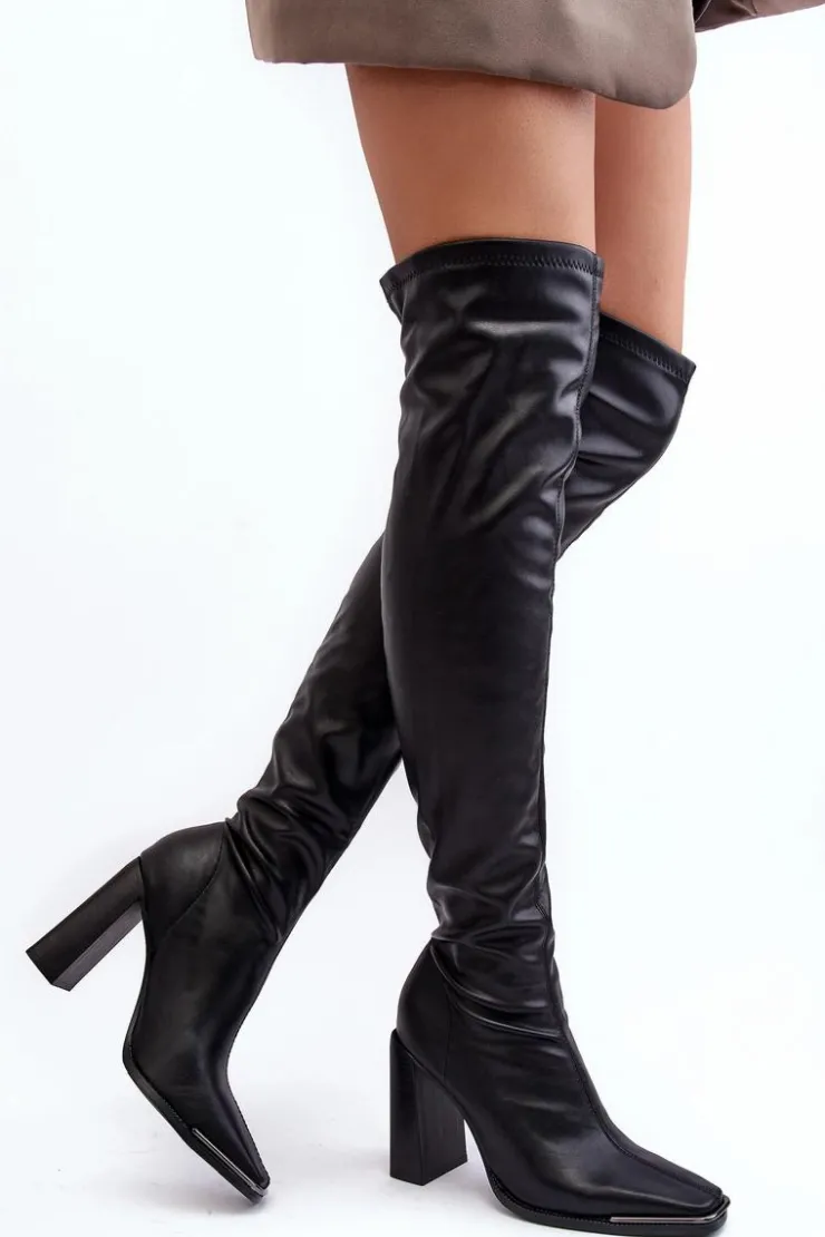 Stylowe kozaki damskie wykonane z eko skóry. Osadzone na obcasie w postaci słupka. Noski w kwadrat. Model wsuwany. Cholewka za kolano ozdobiona przeszyciami. Idealne do sukienek i spódnic. Koniecznie powinnaś je mieć! Przy wyborze rozmiaru prosimy sugerować się tabelą rozmiarów.