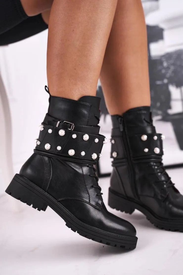 Wyjątkowe botki wykonane ze skóry ekologicznej, ozdobione pięknymi perełkami. Klasycznie sznurowane, dodatkowo zapinane na zamek. Botki ocieplone są miłym w dotyku kocem obuwniczym. Przy wyborze rozmiaru prosimy sugerować się tablicą rozmiarów.