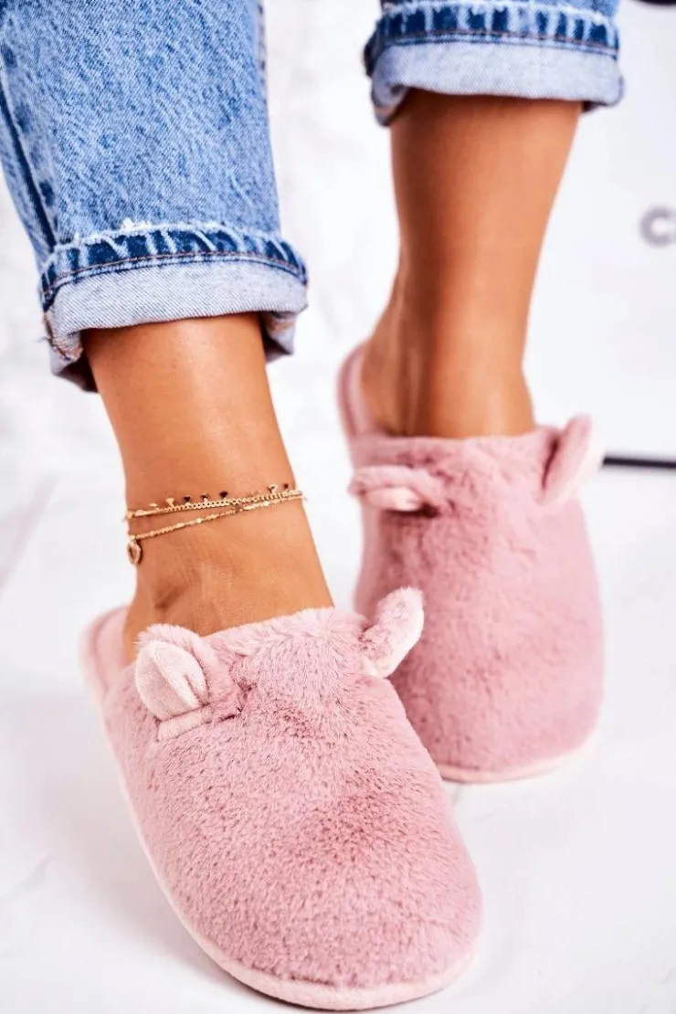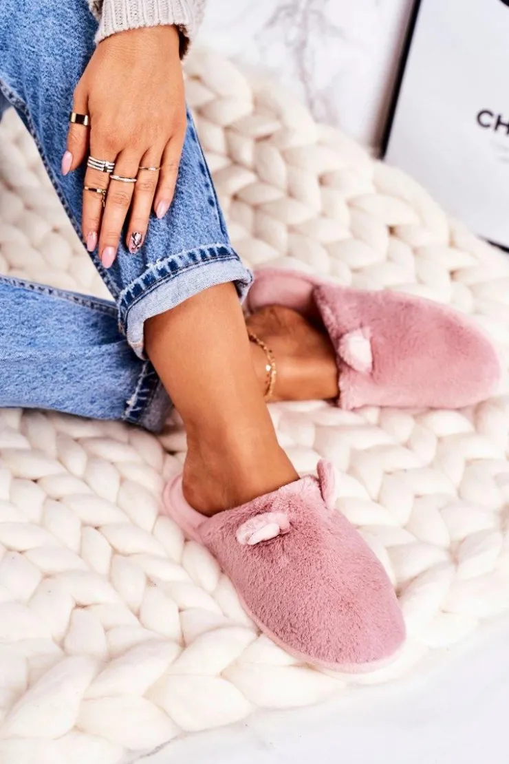 Boto Kapcie Klasyczne*Damskie Futrzane Papcie Z Uszami Pudrowy Róż Hippo
