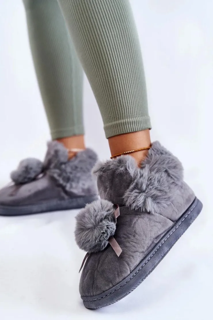 Wsuwane papcie damskie zostały wykonane z miłej w dotyku tkaniny. Model ten posiada na śródstopiu futrzany pompon z kokardką. Dodatkowo papcie zostały ocieplone wewnątrz eko futerkiem. Model osadzony na płaskiej, gumowej podeszwie. Idealne do domowego zacisza w jesienno-zimowe dni. Przy wyborze rozmiaru prosimy kierować się tabelą rozmiarów.