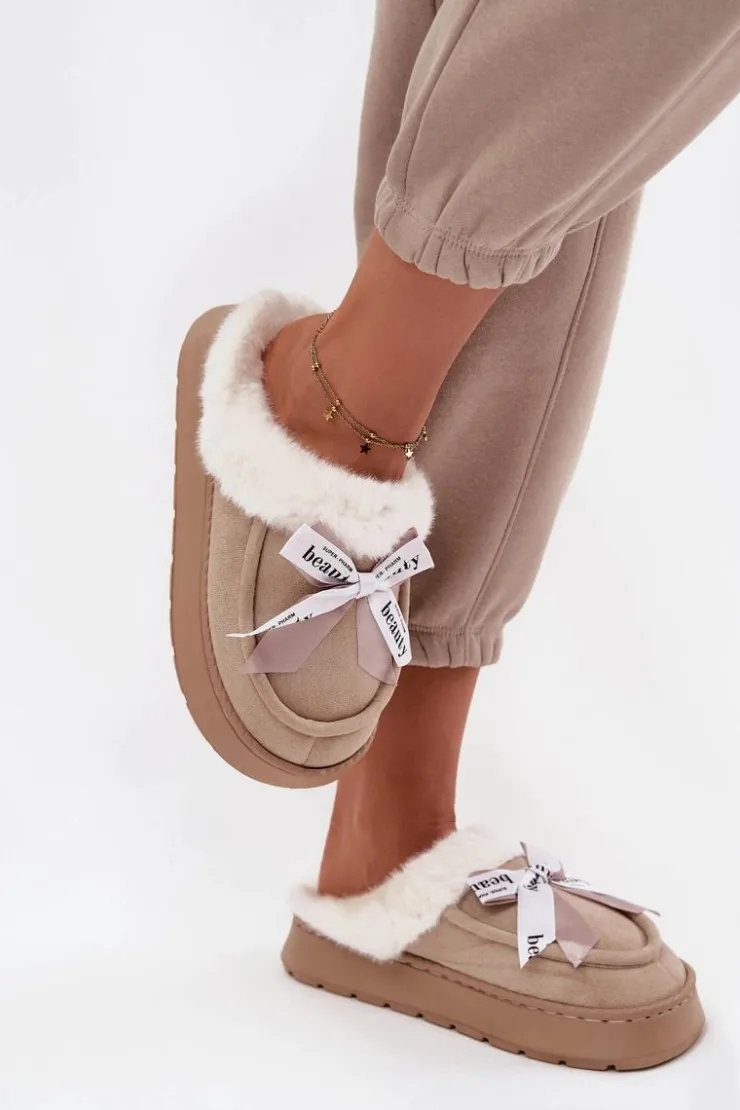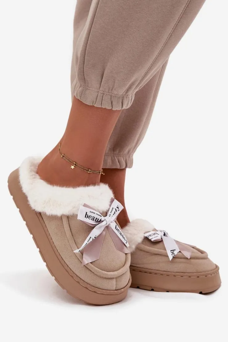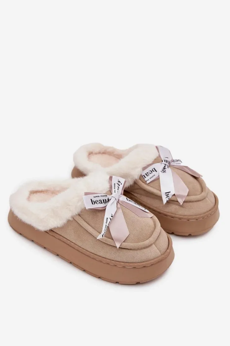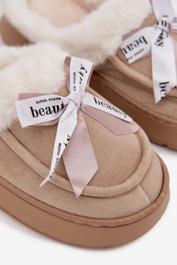 Damskie kapcie wykonane z miękkiej, eko zamszowej tkaniny. Osadzone na grubszej podeszwie zapewniają stabilność i komfort podczas chodzenia po domu. Wnętrze ocieplone puszystym futerkiem otula stopy ciepłem, sprawiając, że są idealne na chłodniejsze dni. Urocza kokardka z napisami umieszczona z przodu nadaje im dziewczęcego uroku i wyróżnia je na tle klasycznych modeli. To kapcie, które doskonale łączą praktyczność z modnym wyglądem. Przy wyborze rozmiaru prosimy sugerować się tabelą rozmiarów.