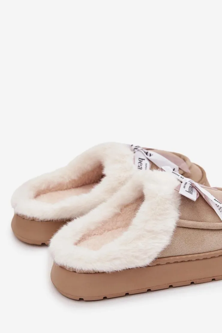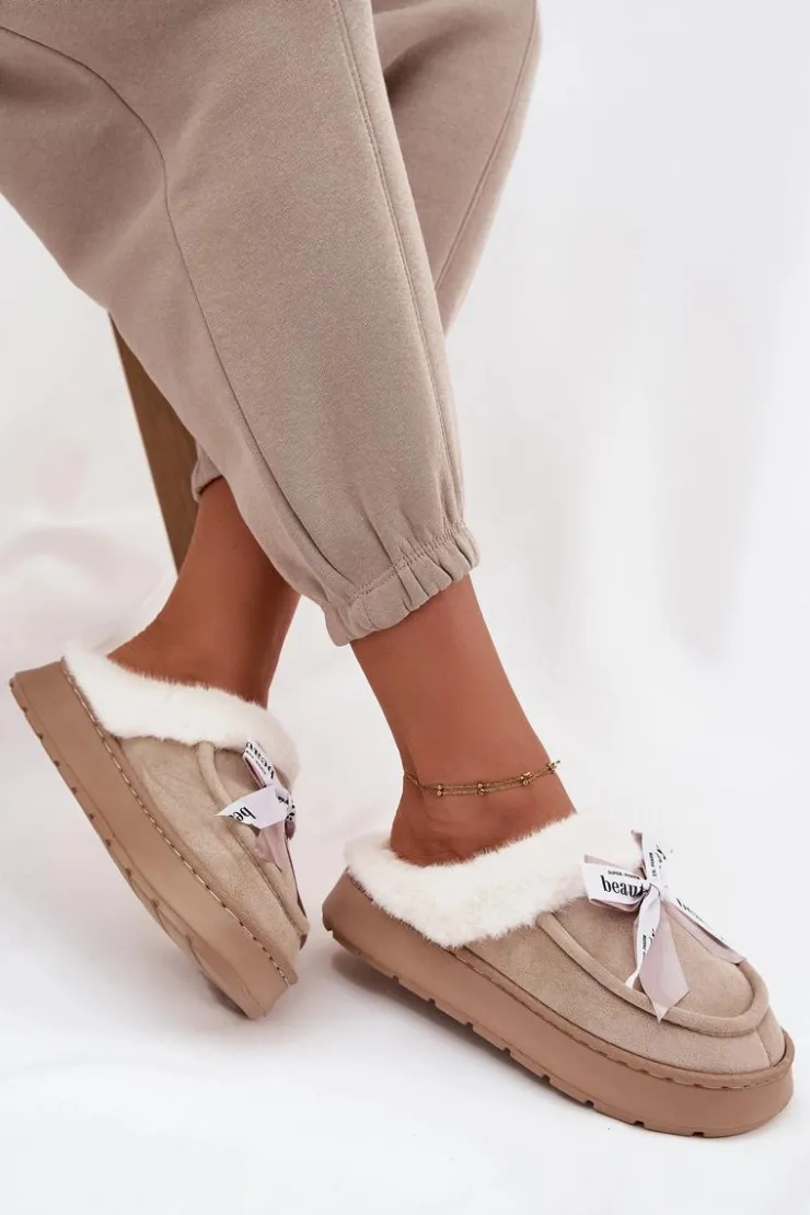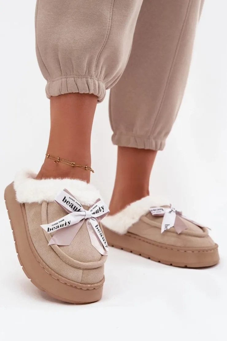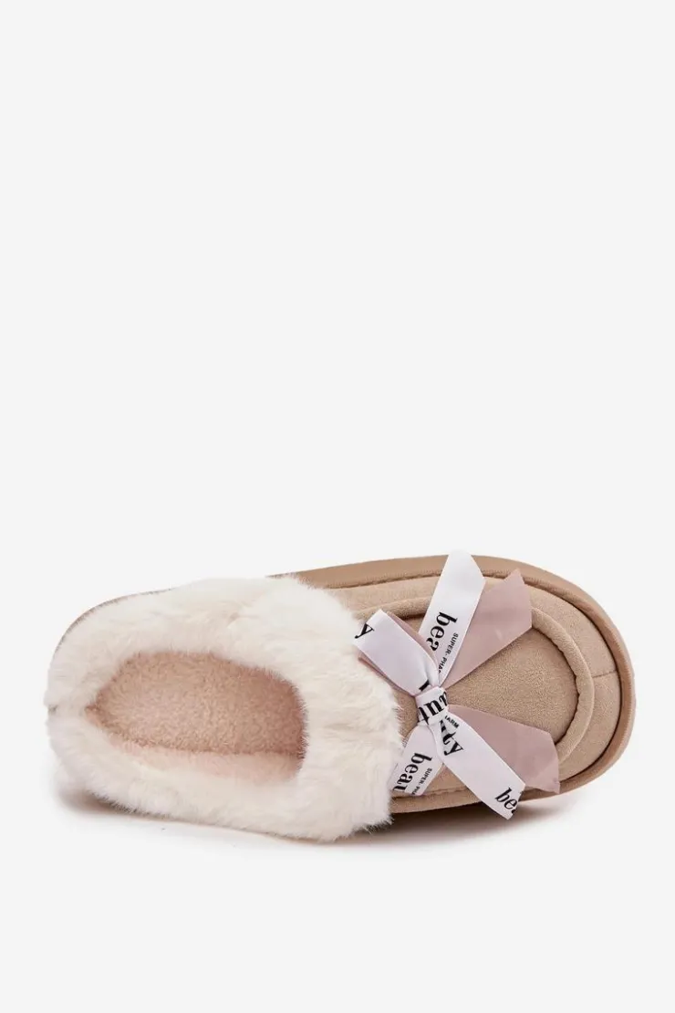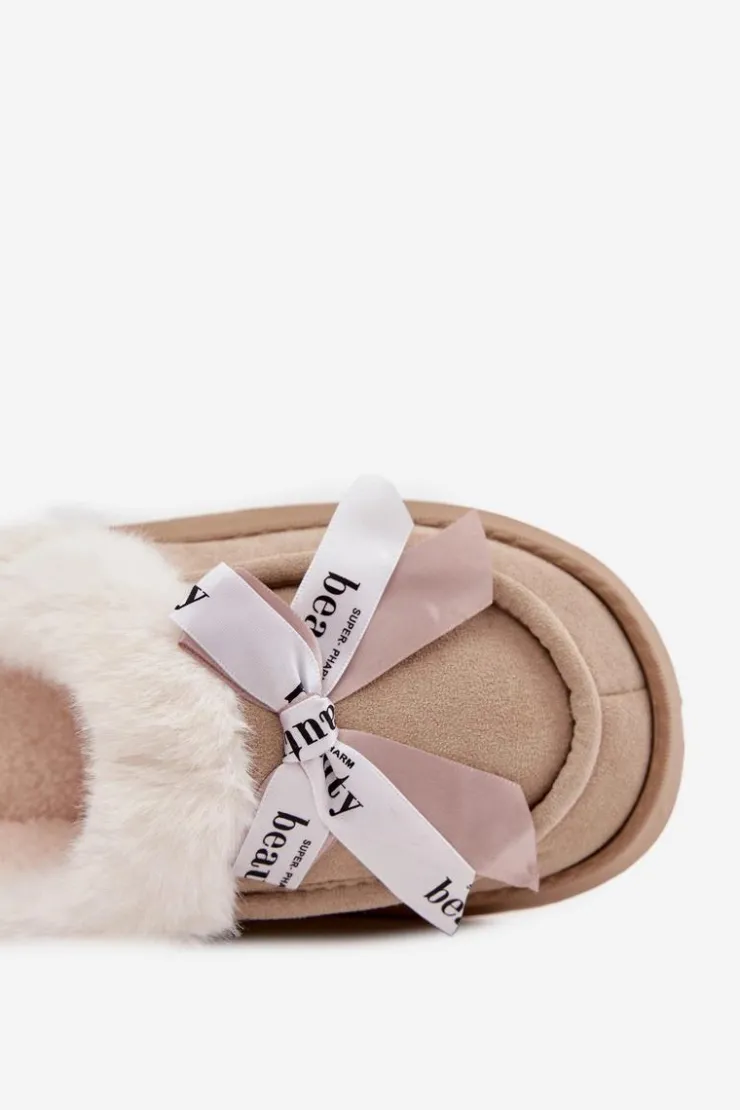 Damskie kapcie wykonane z miękkiej, eko zamszowej tkaniny. Osadzone na grubszej podeszwie zapewniają stabilność i komfort podczas chodzenia po domu. Wnętrze ocieplone puszystym futerkiem otula stopy ciepłem, sprawiając, że są idealne na chłodniejsze dni. Urocza kokardka z napisami umieszczona z przodu nadaje im dziewczęcego uroku i wyróżnia je na tle klasycznych modeli. To kapcie, które doskonale łączą praktyczność z modnym wyglądem. Przy wyborze rozmiaru prosimy sugerować się tabelą rozmiarów.