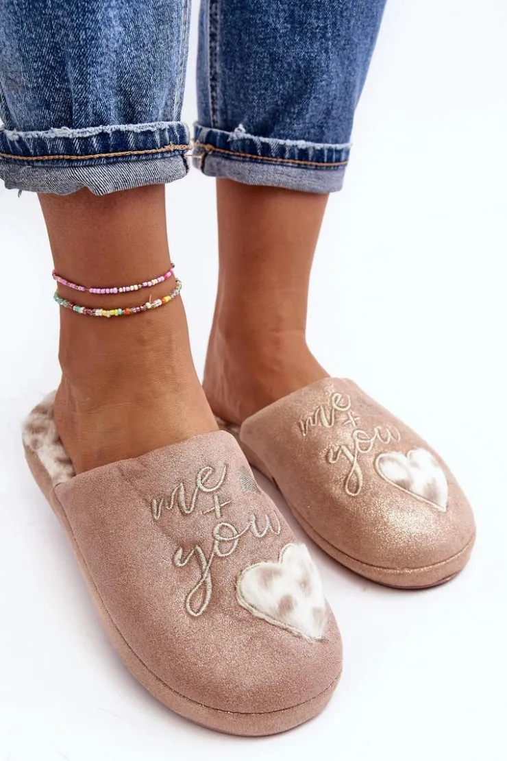 Błyszczące kapcie damskie ozdobione napisem i sercem. Model wsuwany z zakrytym noskiem. Osadzone na grubej podeszwie. Wkładka ocieplona futerkiem. Przy wyborze rozmiaru prosimy kierować tabelą rozmiarów.