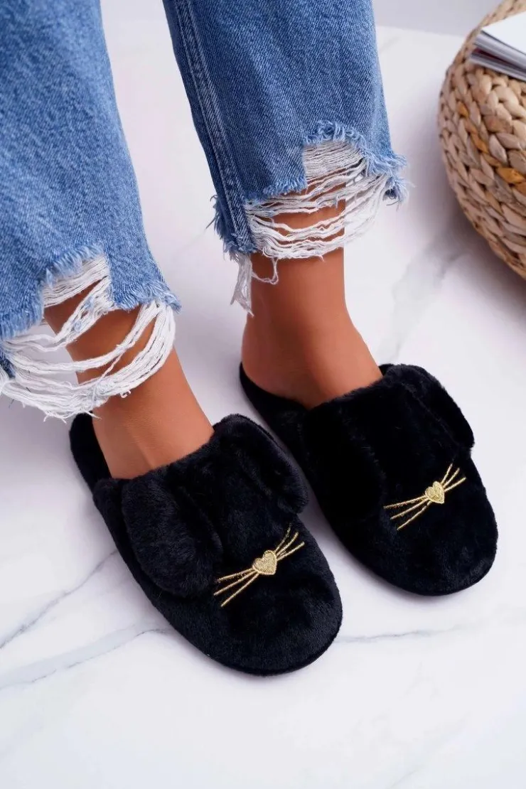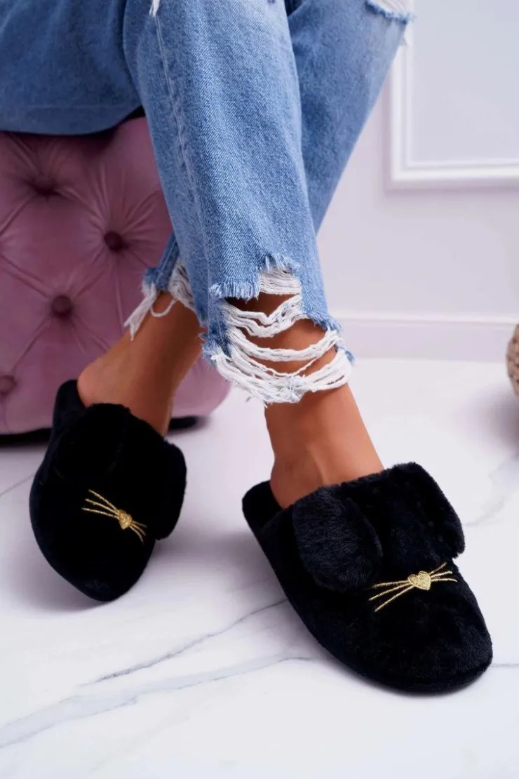 Boto Kapcie Klasyczne*Papcie Damskie Z Futerkiem I Uszkami Czarne Semmi