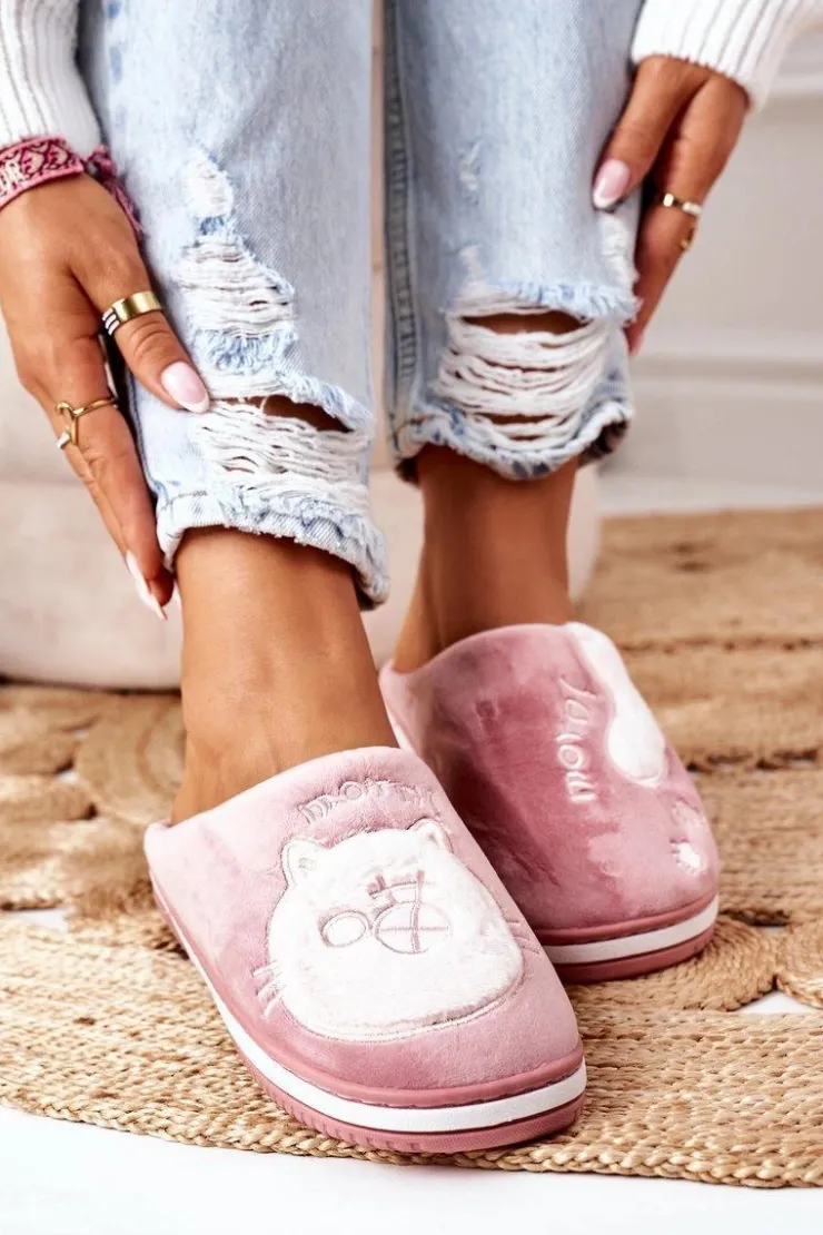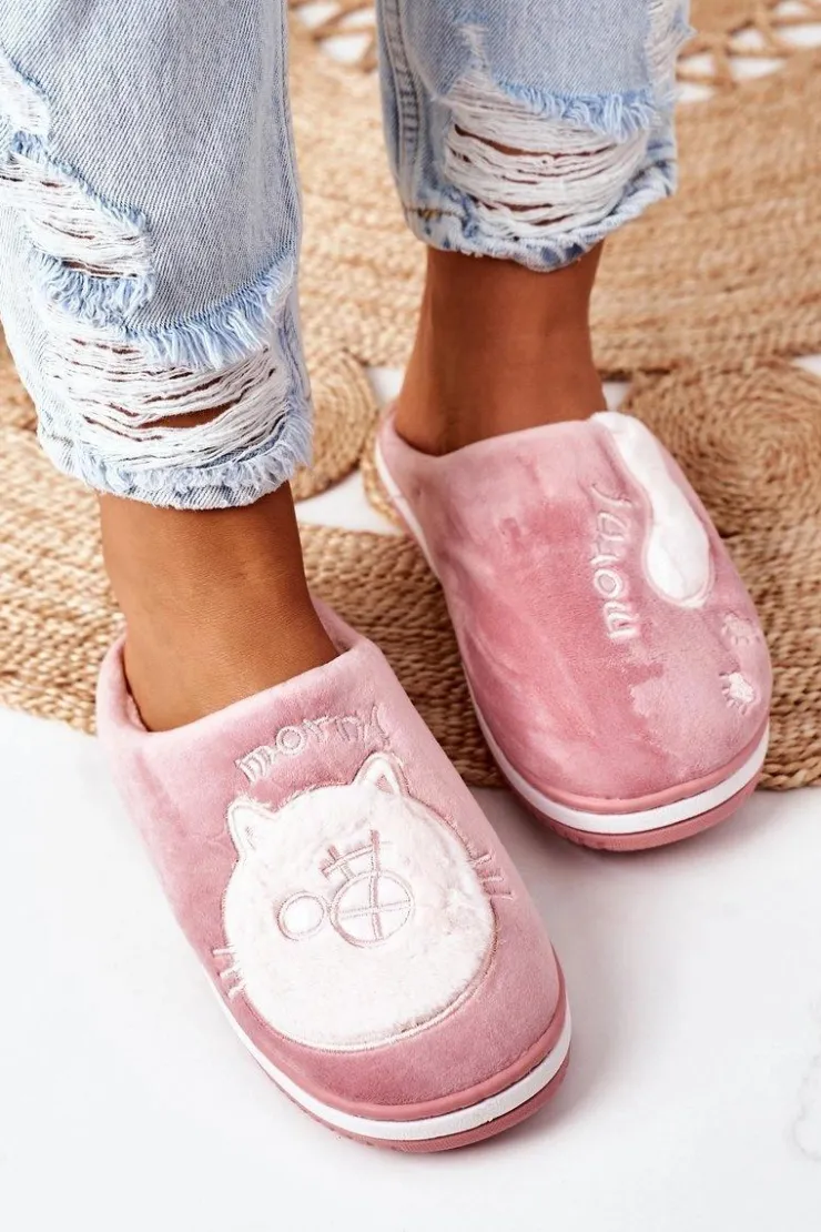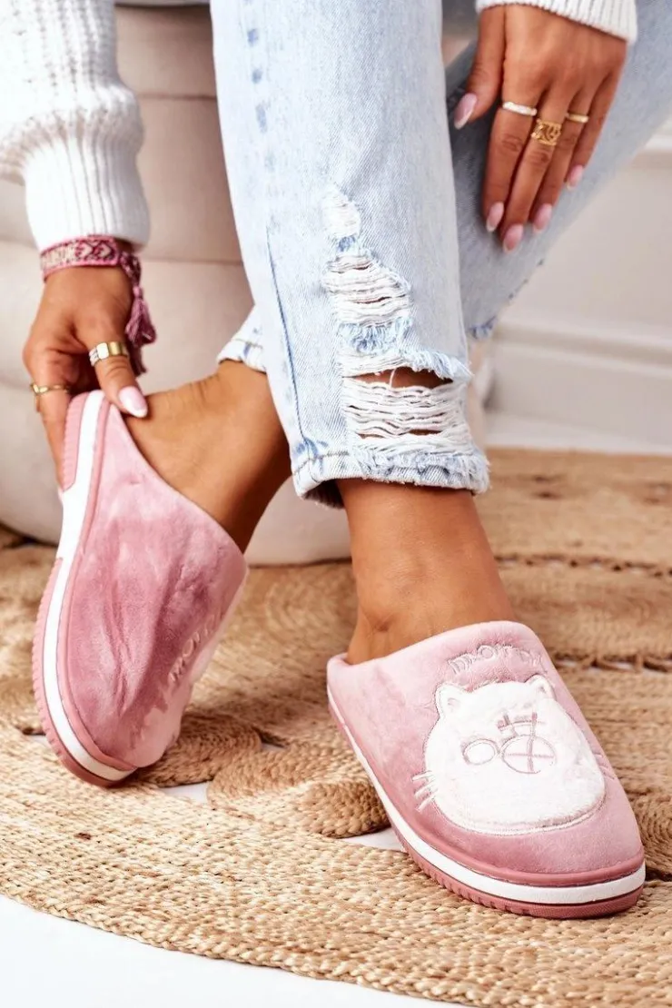 Boto Kapcie Klasyczne*Welurowe Papcie Z Kotem Ciemnoróżowe Good Morning