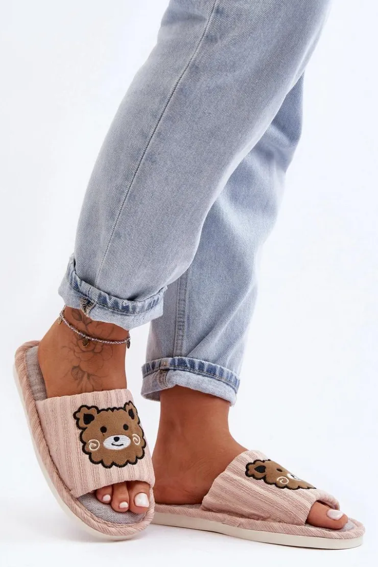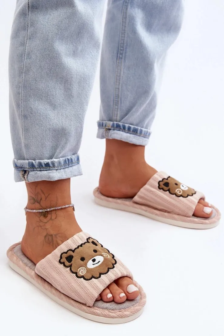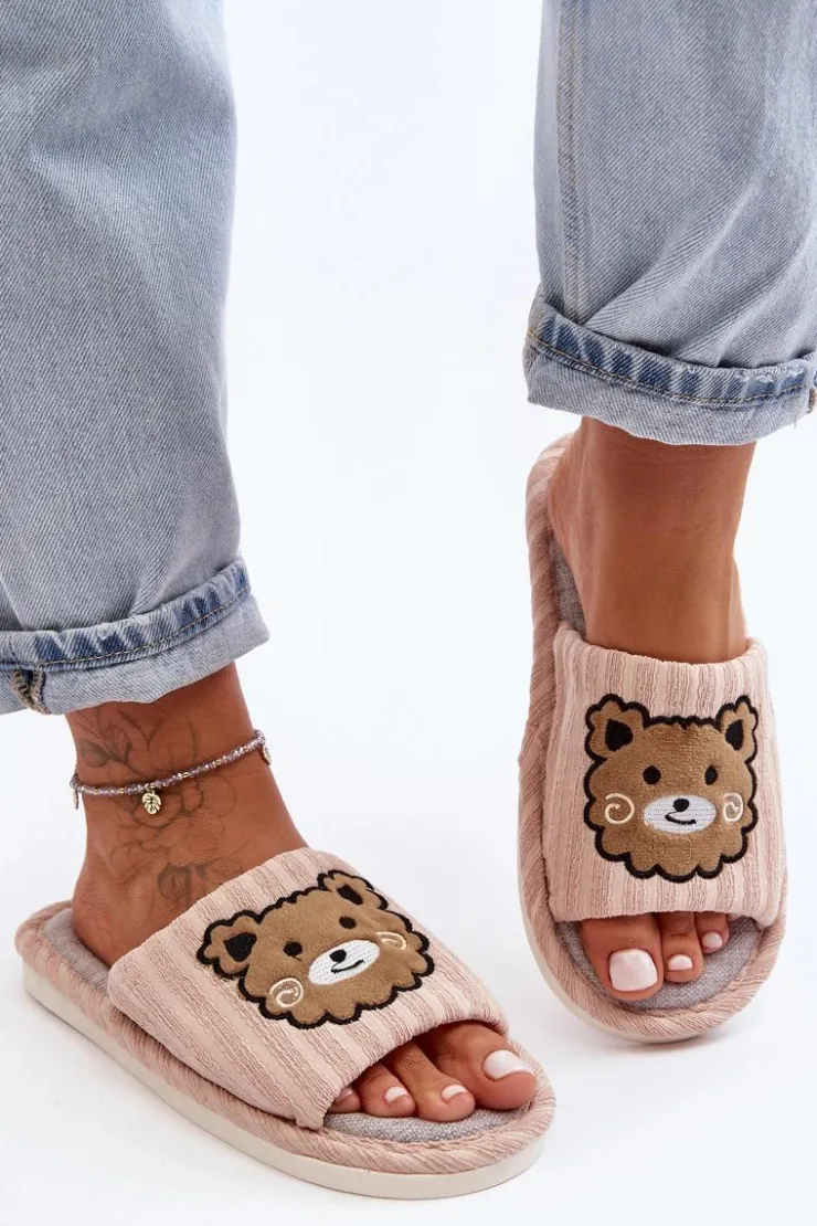 Kapcie damskie wykonane z materiału tekstylnego. Osadzone na płaskiej, gumowej podeszwie. Z przodu znajdują się naszywki misie. Noski otwarte. Idealne na relaks w domowym zaciszu! Przy wyborze rozmiaru prosimy kierować się tabelą rozmiarów.