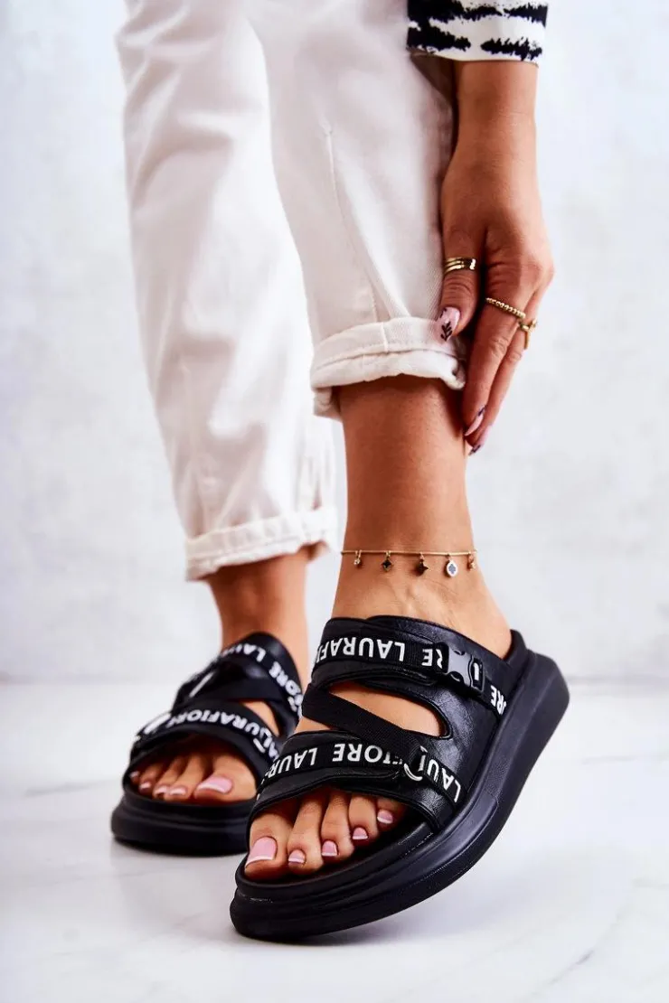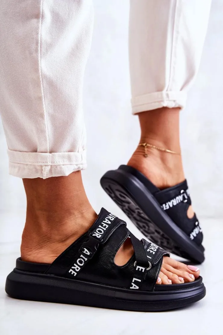 Klasyczne, wsuwane klapki marki La.Fi. Wykonane z wysokiej jakości eko skóry. Posiadają materiałowe paski oraz zapinanie na klamrę. Osadzone na masywnej platformie wykonanej z tworzywa sztucznego. Wkładka jest dodatkowo profilowana. Model z okrągłym, odkrytym noskiem. Idealne na co dzień ! Ten model z pewnością skradnie Twoje serce, dlatego nie czekaj dłużej i zamów już dziś! Przy wyborze rozmiaru prosimy kierować się tabelą rozmiarów.