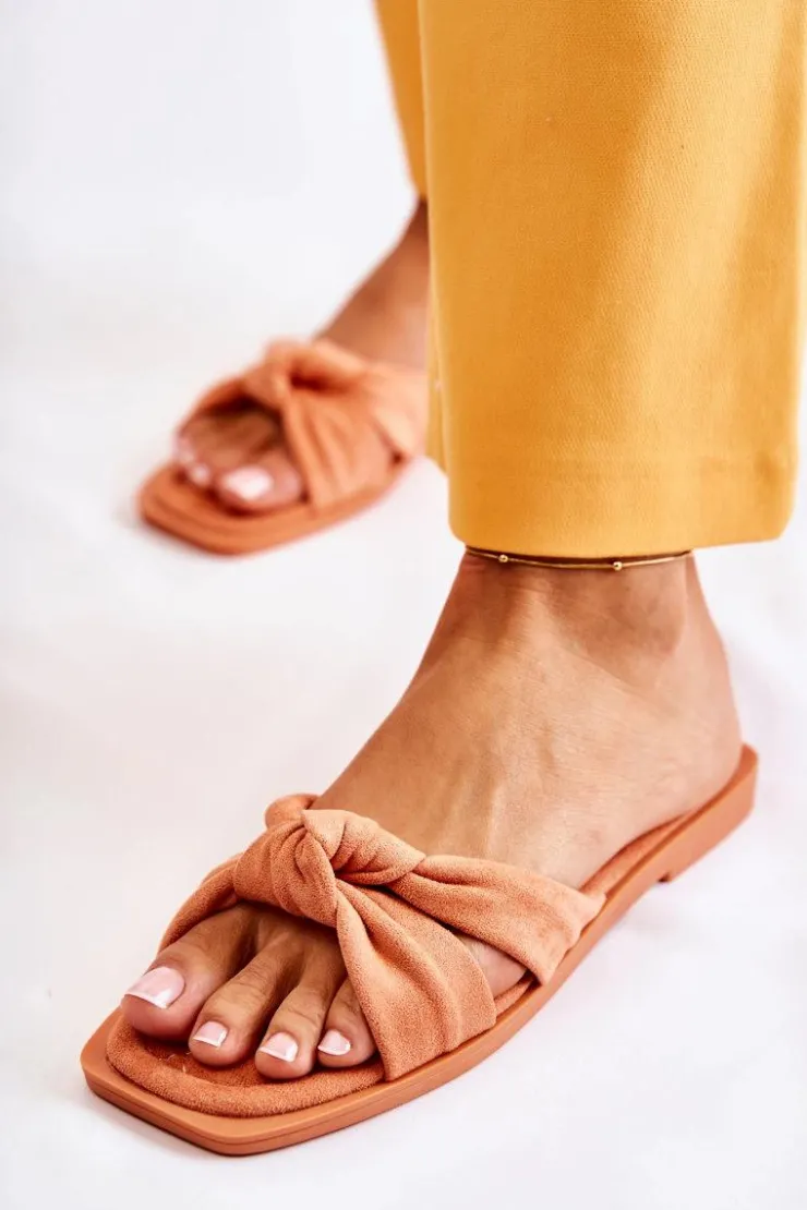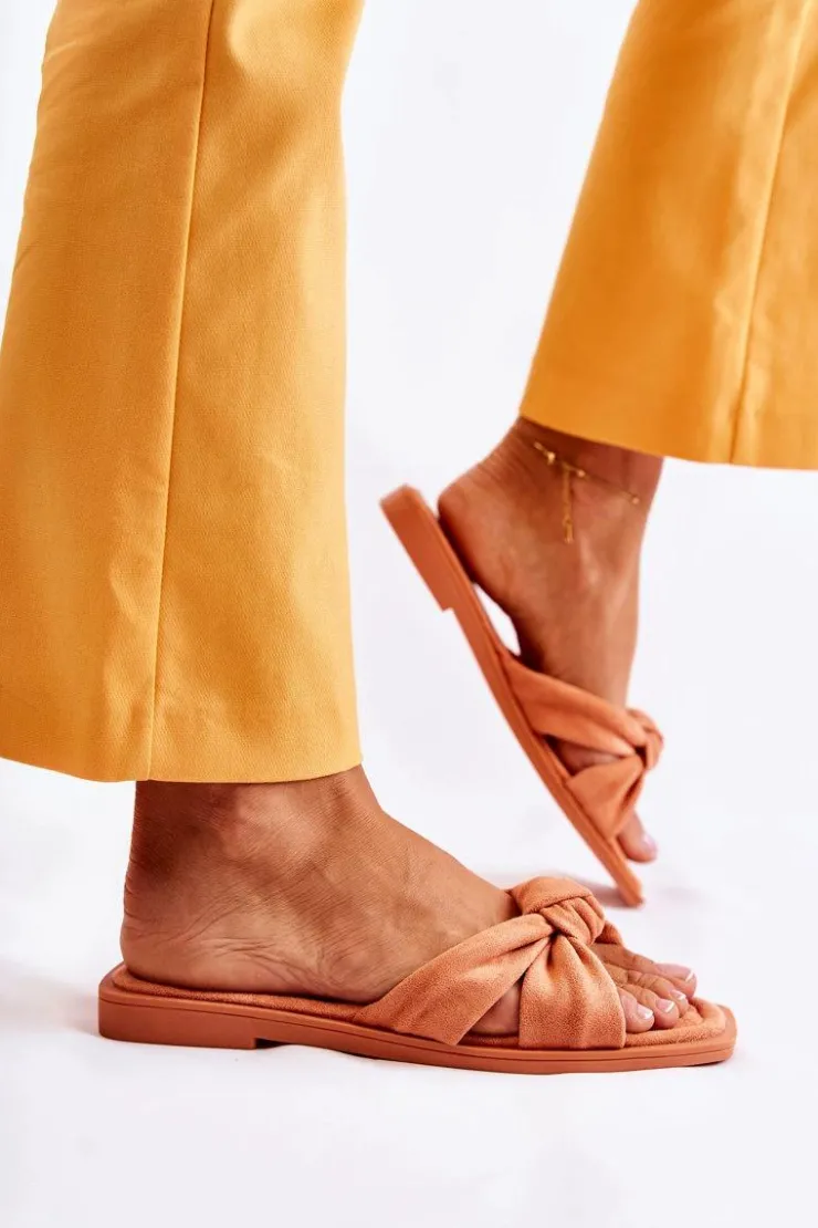 Klasyczne klapki damskie zostały wykonane z miłego w dotyku eko zamszu. Paski klapek łączą się na przodzie tworząc supełek. Wkładka jest pikowana i także wykonana z eko zamszu. Klapki osadzone na płaskim obcasie. Model, który świetnie sprawdzi się podczas codziennych aktywności, np.: podczas zakupów czy spaceru. Klapki te posiadają odkryty, kwadratowy nosek. Przy wyborze rozmiaru prosimy sugerować się tabelą rozmiarów.