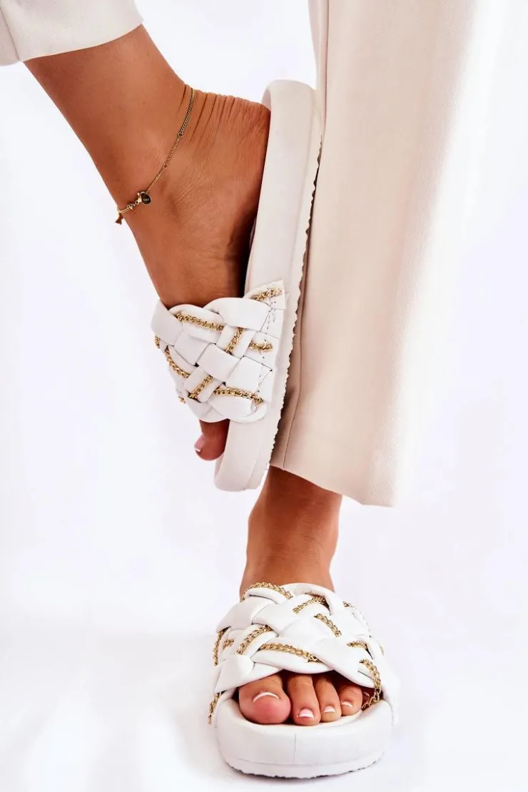 Modne klapki wykonane z eko skóry. Posiadają pleciony pasek z ozdobnym, delikatnym łańcuszkiem. Osadzone na platformie. Wkładka wykonana z gumowego tworzywa. Nosek odkryty, zaokrąglony. Model, który świetnie wpasuje się w letnie klimaty! Koniecznie powinnaś je mieć! Fason ten będzie pasować do wielu stylizacji. Model klasyczny, wsuwany. Przy wyborze rozmiaru prosimy sugerować się tabelą rozmiarów.