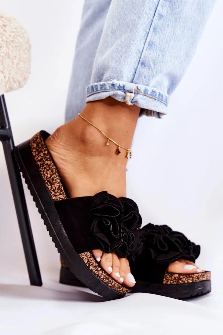 Klasyczne damskie klapki osadzone na masywnej platformie wykonanej z korka oraz tworzywa sztucznego. Na przodzie znajduje się przyszyta ozdoba z eko zamszu. Profilowana wkładka jest wygodna w użytkowaniu nawet przez cały dzień. Model wsuwany. Nie czekaj dłużej i kup już dziś! Koniecznie powinnaś je mieć! Przy wyborze rozmiaru prosimy sugerować się tabelą rozmiarów.