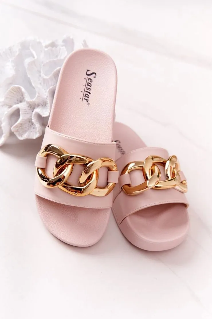 Gumowe klapki damskie z ozdobnym łańcuchem. Cholewka wykonana jest z eko skóry. Koniecznie sprawdź całą naszą kolekcję klapek damskich! Przy wyborze rozmiaru prosimy sugerować się tabelą rozmiarów.