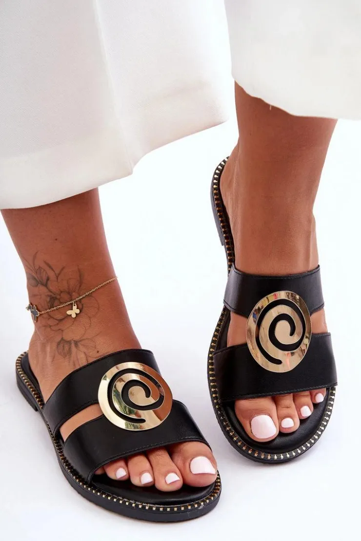 Ten model powinien być Twój! Damskie klasyczne klapki zostały wykonane z wierzchu z tworzywa. Posiadają na przodzie lustrzaną ozdobę. Klapki osadzono na płaskim obcasie i podeszwie z tworzywa sztucznego. Wkładka jest niezwykle miękka i wygodna w użytkowaniu, co zwiększa komfort użytkowania. Nosek w tych klapkach jest odkryty i lekko zaokrąglony. Dodatkowo przy podeszwie znajdują się ozdobne ćwieki. Przy wyborze rozmiaru prosimy sugerować się tabelą rozmiarów.