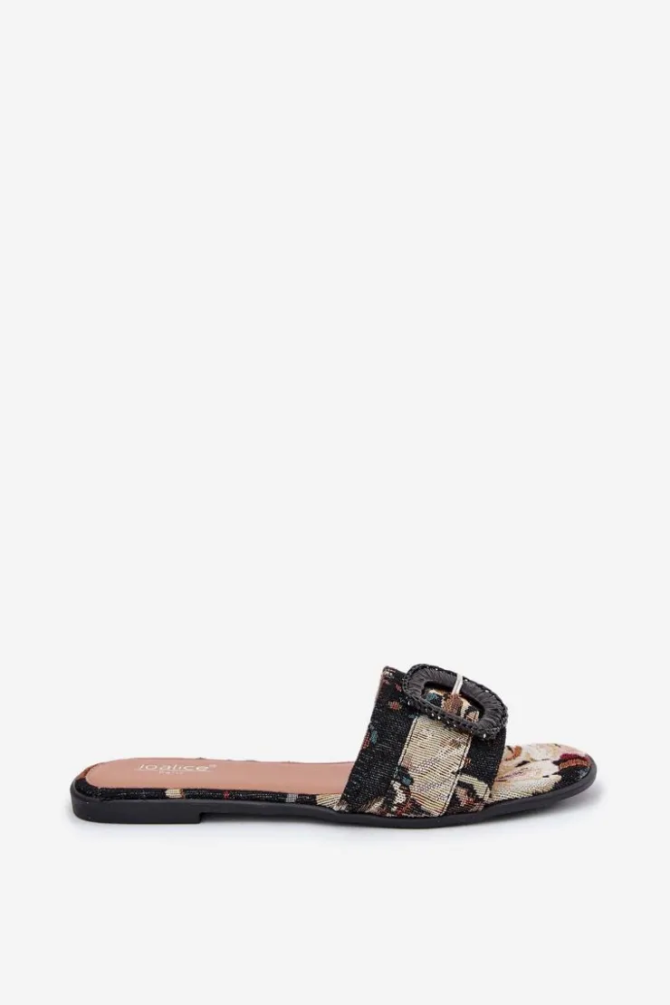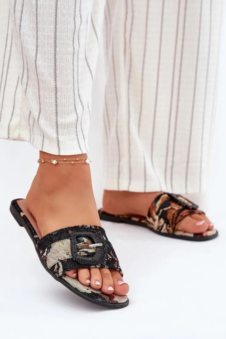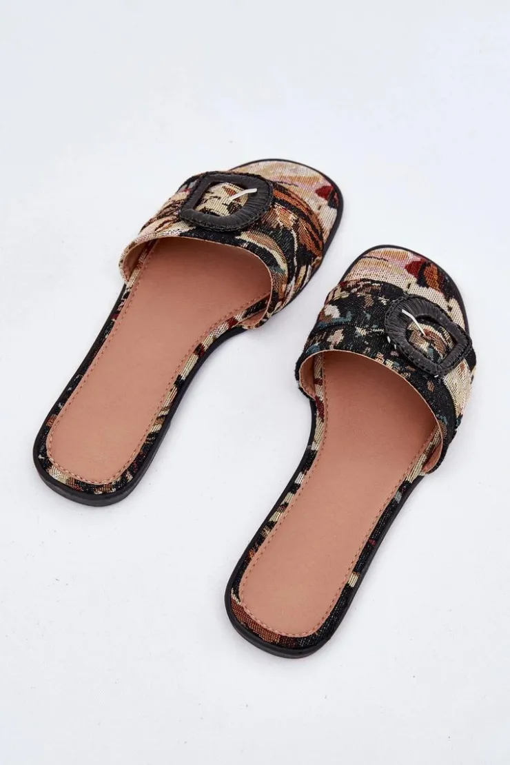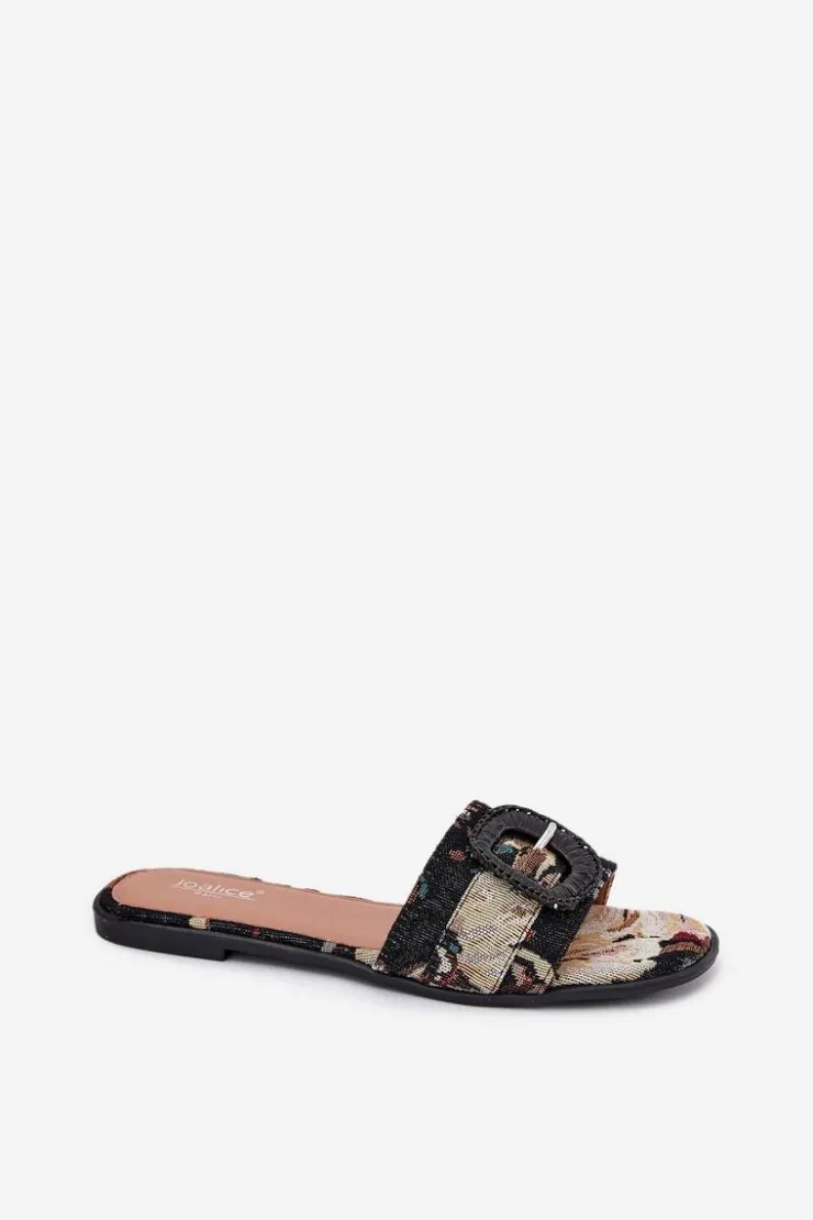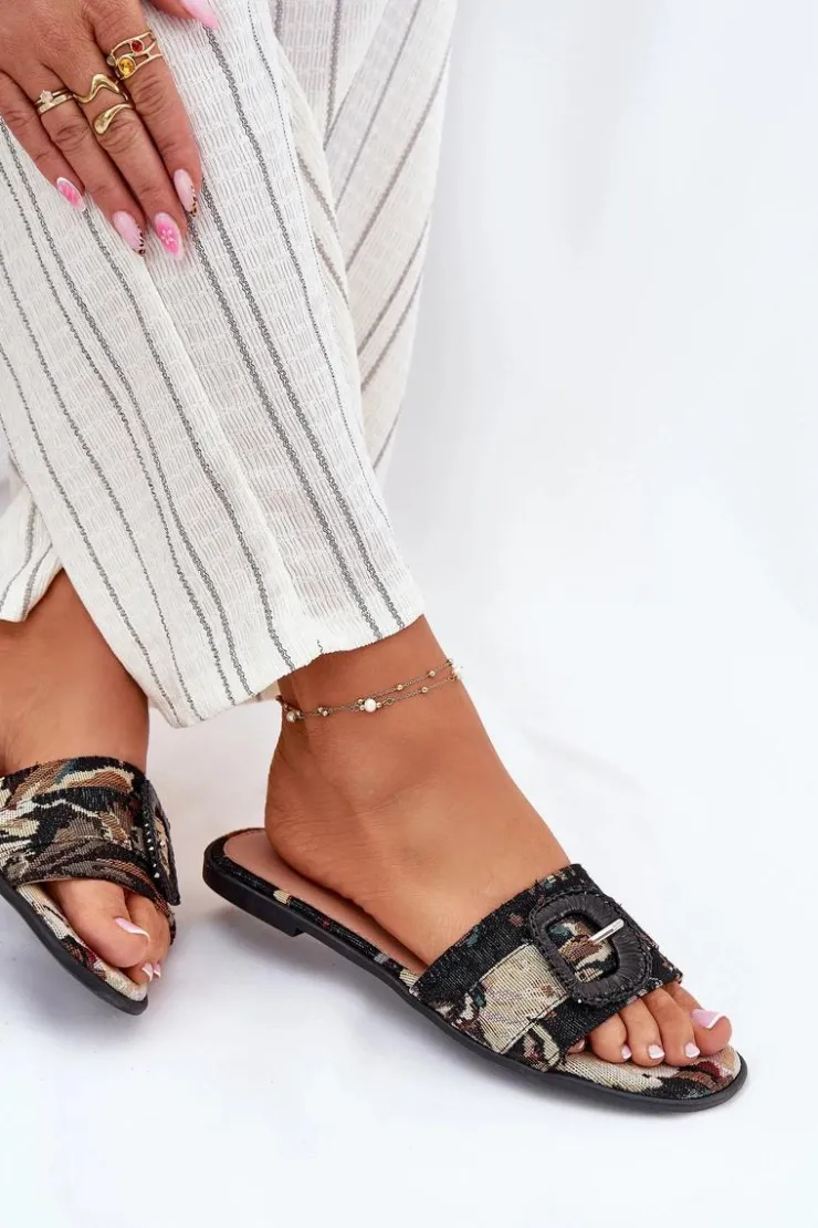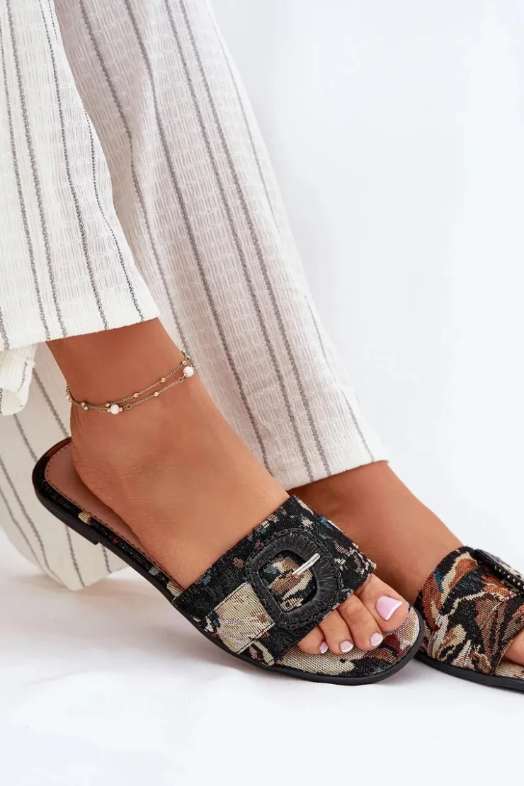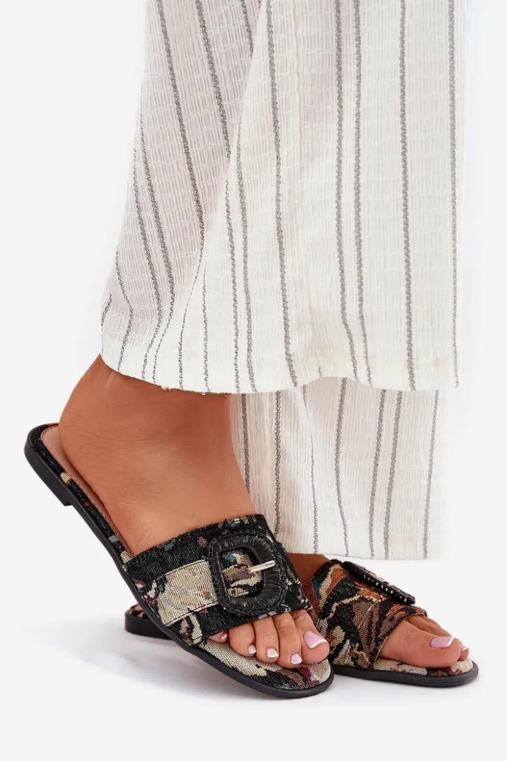 Klapki damskie na płaskim obcasie, wykonane z materiału tekstylnego. Z przodu wyróżnia je ozdobna klamra, która dodaje stylu i elegancji. To doskonały wybór na letnie dni – lekkie, wygodne i modne, świetnie sprawdzą się na co dzień. Przy wyborze rozmiaru prosimy sugerować się tabelą rozmiarów.